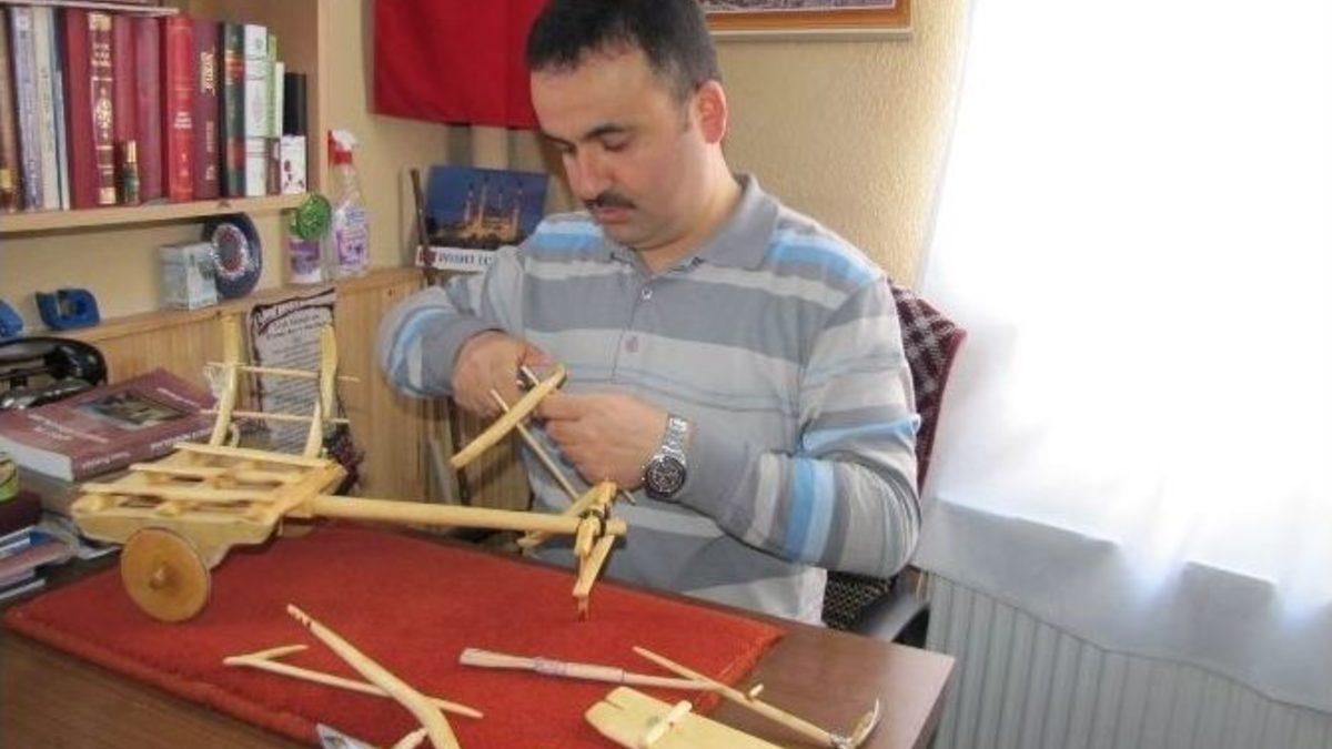 Kütahya’nın Hisarcık ilçesi Çimenlik Camiinde İmam Hatiplik yapan Ahmet Gündüz ahşaptan maket kağnı arabası, gemi, uçak ve çeşitli tarım aletleri yapıyor.Boş vakitlerini değerlendirmek amacıyla 10 yıl önce ahşaptan maket araçlar yapmaya başladığını belirten İmam Ahmet Gündüz,” Eski zamanlarda babalarımızın ve dedelerimizin kullandığı onların işlerini kolaylaştıran unutulmaya yüz tutmuş kağnı arabası, pulluk, düven, orak, tırmık ve yaba gibi aparatların çam ve kavak ağacından maketlerini sadece bıçak ve zımpara kullanarak imal ediyorum. Ahşaptan maket yapımı incelik ve sabır isteyen bir uğraş. Bir kağnı arabasını yapmam 14-15 saatimi alıyor. Ayrıca gemi ve uçak maketleri de yapıyorum.”dedi.Yıllardan beri hobi amaçlı bu sanatı evinde sürdürdüğünü ve artık ahşap maket eserlerini sergilemek istediğini söyleyen Gündüz,” Açacağım sergi sayesinde eski zamanlarda kullanılan tarım aletlerini genç nesillerin görmesini istiyorum. Ayrıca talep halinde ahşaptan istenen her türlü aracı yapabilir veya elimdekileri verebilirim.” diye konuştu. (MA-EFE)