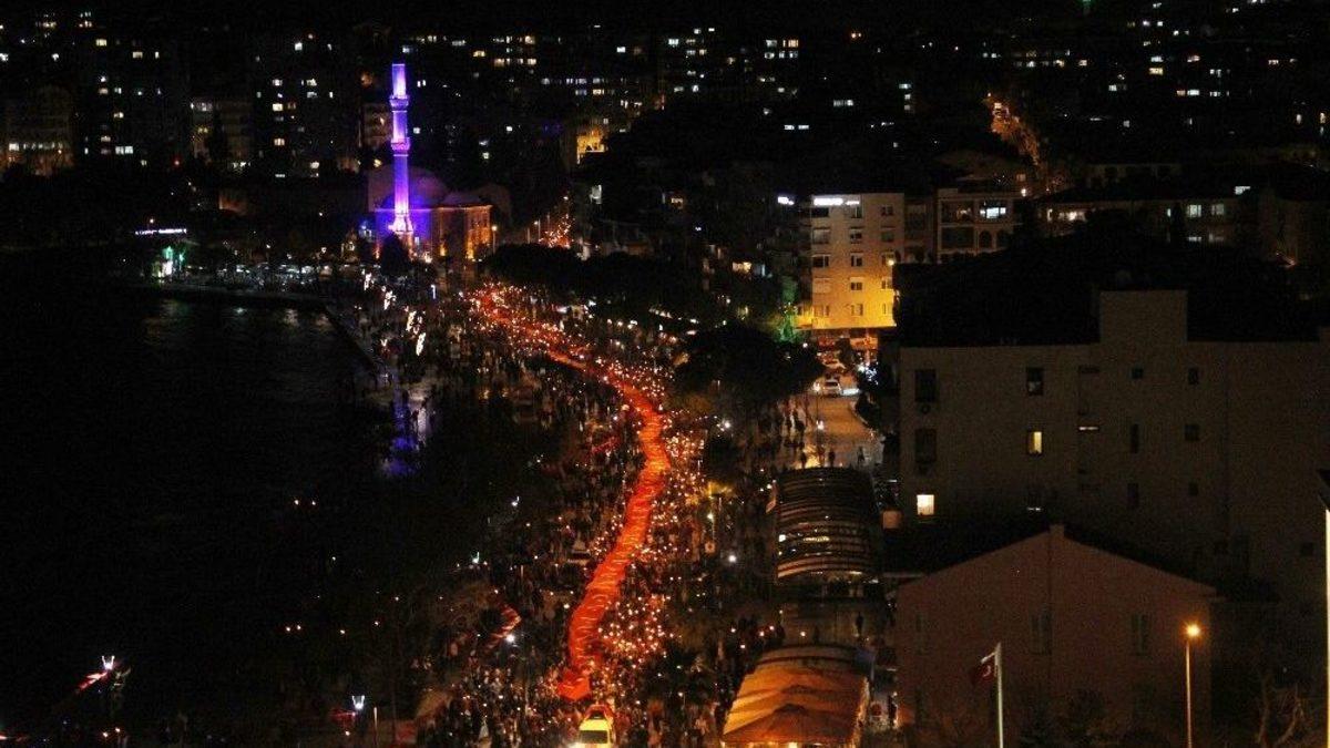 Çanakkale’de 18 Mart Deniz Zaferi’nin 103. yıl dönümü ve Şehitleri Anma Günü etkinlikleri kapsamında fener alayı düzenlendi. Binlerce kişinin katıldığı Fener Alayı’nda 500 metrelik Türk Bayrağı açıldı.Çanakkale Gençlik Hizmetleri ve Spor Müdürlüğü koordinasyonunda, 18 Mart Deniz Zaferi’nin 103. yıl dönümü ve Şehitleri Anma Günü etkinlikleri kapsamında Fener Alayı düzenlendi. Cumhuriyet Meydanı’nda saat 19.30’da başlayan Fener Alayı’na binlerce kişi katıldı. Fener Alayı’nda 500 metrelik Türk Bayrağı açıldı. Ayrıca yürüyüşe katılan vatandaşlara meşale, Türk bayrağı ve zeytin dalı dağıtıldı.Demircioğlu Caddesi’nden İnönü Caddesi’ne ilerleyen kalabalık, eski Salı Pazarı yokuşu kavşağından Kayserili Ahmetpaşa Caddesi’ne yöneldi. Kordon boyunca marşlarla ilerleyen kalabalık, Truva Atı önüne kadar geldi. Kordon Boyu’nda son bulan Fener Alayı’nın ardından 18 Mart Şehitleri Anma Günü ve Çanakkale Deniz Zaferi’nin 103.yıl dönümü etkinlikleri kapsamında Genelkurmay Başkanlığı’nın Mehteran takımı İskele Meydanı’nda konser verdi.
