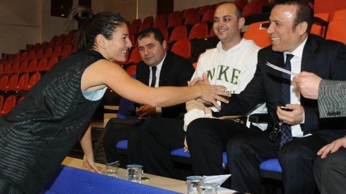 Canik Belediyespor oyuncuları, idman sonunda, kendilerini izleyen minik basketbolculara şeker ikram etti.