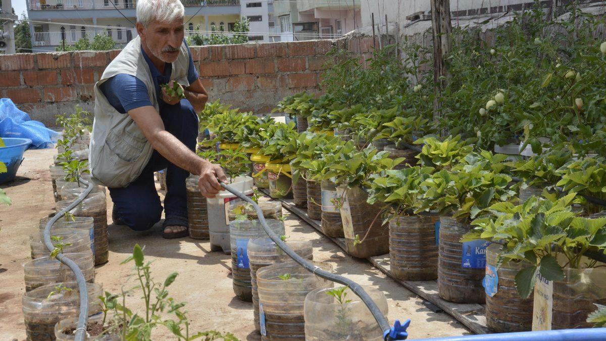 İlçenin Dicle mahallesinde yaşayan Faik Topal, 3 ay boyunca çöplerden biriktirdiği atık malzemelerle 2 katlı evinin çatısında, organik sebze ve bazı meyveleri yetiştiriyor.