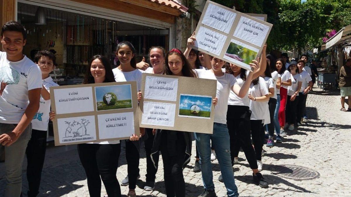 5 Haziran Dünya Çevre Günü kapsamında okullarının çevresini temizleyen öğrenciler, Alaçatı çarşısında da pankartlarla ve sloganlarla yürüyüş yaparak çevre duyarlılığına dikkat çekti.