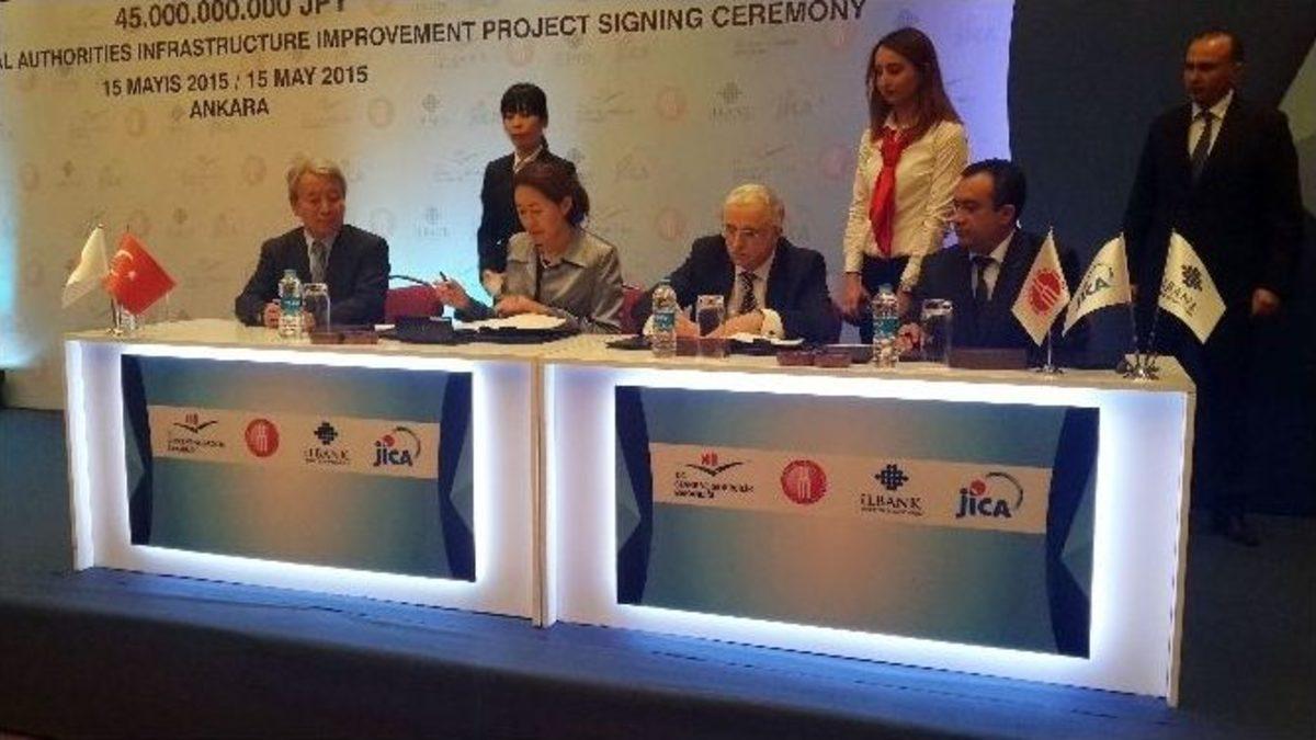 Çevre ve Şehircilik Bakanlığı, Hazine Müsteşarlığı, İlbank A.Ş. ve Japonya Uluslararası İşbirliği Ajansı (JICA) arasında Suriyeliler’in yaşadığı belediyeler için 375 milyon dolarlık kredi anlaşması imzalandı.Türkiye’ye gelen Suriyeliler’in ağırlıklı olarak yaşadığı illerde ortaya çıkan altyapı sorunlarının çözümüne yönelik çalışmalarda kullanılmak üzere Çevre ve Şehircilik Bakanlığı, Hazine Müsteşarlığı, İlbank A.Ş., JICA arasında 375 milyon dolarlık kredi anlaşması imzalandı. Kredi anlaşmasının garantörü İlbank A.Ş. oldu. Kredi anlaşması imza töreni, iki ülke ulusal marşlarının okunmasıyla başladı. Törene Çevre ve Şehircilik Bakanı İdris Güllüce, İlbank A.Ş. Genel Müdürü Mehmet Turgut Dedeoğlu, JICA Başkanı Akihiko Tanaka, Hazine Müsteşar Yardımcısı Ahmet Genç, Japonya Büyükelçisi Yutaka Yokoi katıldı.İlbank A.Ş. Genel Müdürü Mehmet Turgut Dedeoğlu, kredi miktarının 7 yıl ödemesiz, 25 yıl vadeli olduğunu açıkladı.JICA Başkanı Akihiko Tanaka, 1950’den beri JICA olarak Türkiye’de yardım çalışmalarını yürüttüklerini belirterek, o çalışmaların meyvelerini görmeye başladıklarını söyledi. Tanaka, kredi anlaşmasının Türkiye’de Suriyeliler’in yaşadığı bölgelerdeki altyapı sorunlarının çözümüne yönelik imzalandığını ve bu projenin sorunların çözümünde etkili olacağını düşündüğünü dile getirdi.Çevre ve Şehircilik Bakanı İdris Güllüce ise, Japon halkına ve JICA’ya desteklerinden dolayı teşekkürlerini ileterek, Japon halkının tarih boyunca yaptığı destekleri unutmadıklarını ve kutsadıklarını ifade etti. Bakan Güllüce, Suriye olaylarının Türkiye’yi olumsuz etkilediğine dikkat çekerek, “Savaş halinde karşılaşacağımız problemlerden daha büyük problemlerle karşılaştık. Gelen 2 milyon Suriyeli birçok ülkenin nüfusundan fazla. Yıl sonuna kadar 2,5 milyonu bulacağı söyleniyor. Ben 2,5 milyonu da geçeceğini düşünüyorum. Dünya gelişmiş ülkelerini de kınıyorum. Nerede Birleşmiş Milletler? Nerede insan hakları? Kaç yüz bin daha insan ölmeli ki DAEŞ’e yeter diyelim” dedi.Güllüce, Suriyeli vatandaşların kaldığı yerleri ziyareti sırasında Suriyeliler’in yaşadığı psikolojik travmadan bahsederek, oyuncak verdiği çocukların gülmediklerini söyledi.Konuşmaların ardından imzalanan kredi anlaşması sonrasında toplu hatıra fotoğrafı çektirildi.