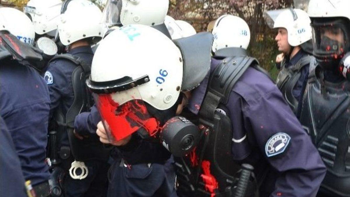 Cumhuriyet Halk Partisi (CHP) Ankara Gençlik Kolları üyeleri, Atatürk Orman Çiftliği’nde yeni yapılan Cumhurbaşkanlığı Sarayı’nı protesto etti. Göstericiler, güvenliği sağlayan güvenlik güçlerine kırmızı boya dolu pet şişe fırlattı.CHP Genel Başkan Yardımcısı Bülent Tezcan’ın da aralarında bulunduğu CHP Gençlik Kolları üyeleri, Atatürk Orman Çiftliği’nde yeni yapılan Cumhurbaşkanlığı Sarayı’nı protesto etmek için Çiftlik Caddesi üzerindeki Atatürk Orman Çiftliği Müdürlüğü önünde toplandı. Grup, açtığı pankart ile yeni yapılan Cumhurbaşkanlığı Sarayı’na yürümek istedi. Çevik kuvvet ekipleri, Cumhurbaşkanlığı’na çıkan caddede önlem aldı. CHP Genel Başkan Yardımcısı Tezcan, caddenin açılması yönündeki isteğini güvenlik güçlerine iletti. Güvenlik güçlerinin bulundukları yerde basın açıklama yapmasına izin verdiği grup, daha sonra kırmızı boya dolu pet şişeyi yere döktü. Protestonun daha yeni başladığını ifade eden bir eylemci, elindeki zincirle göstericileri Cumhurbaşkanlığı Sarayı’nı mühürlemeye davet etti. Bu sırada grup ile güvenlik güçleri arasında kısa süreli arbede yaşandı. Bir eylemci, kırmızı boya dolu pet şişeyi güvenlik güçlerine fırlattı. Etrafa saçılan boya Emniyet Müdürünün yüzünü ve polislerin kasklarını kırmızıya boyadı. Milletvekillerinin araya girmesiyle grup geri çekilerek dağıldı.