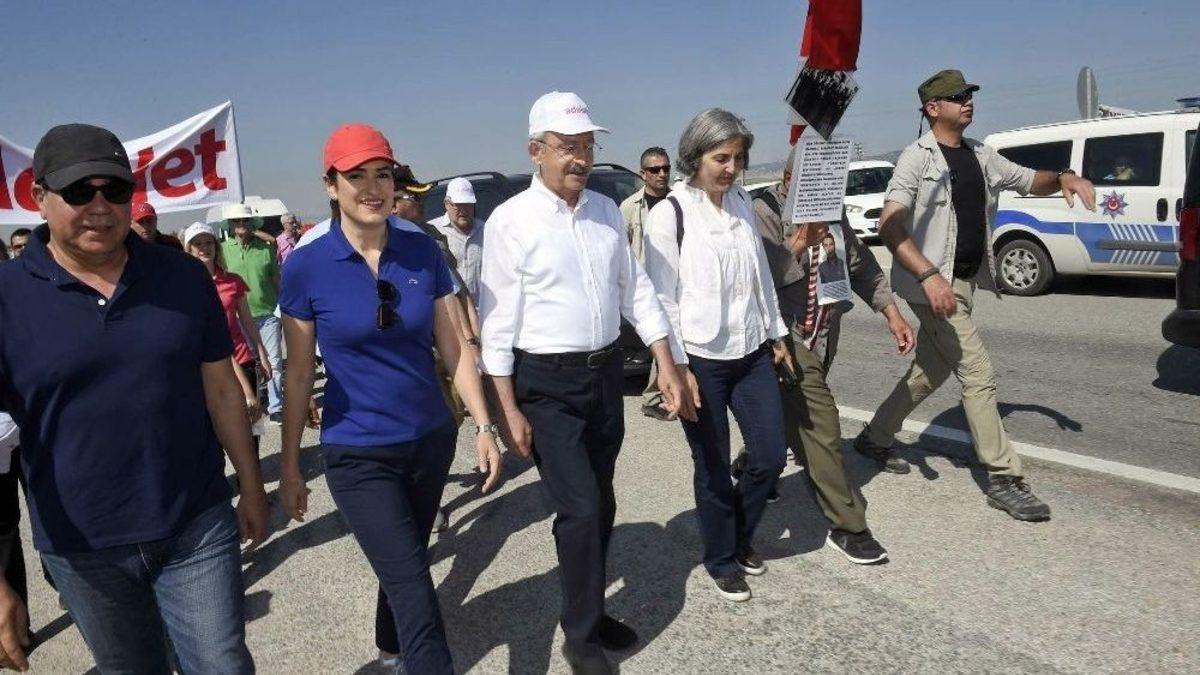 CHP Genel Başkanı Kemal Kılıçdaroğlu, "Bu yürüyüşümüz şehitler için bir yürüyüştür. Bu yürüyüşümüz adaletsizliğe uğrayanlar için bir yürüyüştür. Bu yürüyüşün siyasi kimliği yoktur, etnik kimliği, inanç kimliği yoktur. Bu yürüyüşün temel öznesi insandır ve insan adalet istiyor. Hep birlikte adalet istiyoruz" dedi.CHP Genel Başkanı Kılıçdaroğlu, partisinin İstanbul Milletvekili Enis Berberoğlu’nun tutuklanmasının ardından başlattığı "Adalet Yürüyüşü’nün üçüncü gününde Ankara-İstanbul Karayolunda yürümeye devam ediyor. Kahramankazan ilçesine ulaşan Kılıçdaroğlu, Kahramankazan tabelası önünde yaptığı açıklamada, "Bugün bizim bu yürüyüşümüz bir adalet yürüyüşüdür. Bu yürüyüşümüz şehitler için bir yürüyüştür. Bu yürüyüşümüz adaletsizliğe uğrayanlar için bir yürüyüştür. Bu yürüyüşün siyasi kimliği yoktur, etnik kimliği, inanç kimliği yoktur. Bu yürüyüşün temel öznesi insandır ve insan adalet istiyor. Hep birlikte adalet istiyoruz. Adalet, adalet, adalet. Adaletten yana olan herkesi kucaklıyoruz ve herkesi bekliyoruz” ifadelerini kullandı.’Adalet Yürüyüşü’nün üçüncü gününde Kılıçdaroğlu’na eşi Selvi Kılıçdaroğlu, oğlu Kerem Kılıçdaroğlu ve nişanlısı Mine Alşan’da eşlik ediyor.