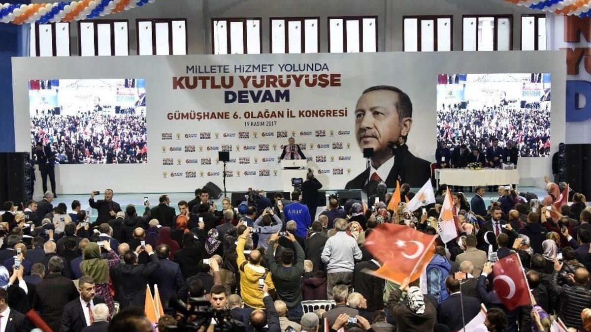 Cumhurbaşkanı Recep Tayyip Erdoğan, Cengizhan’ın Anadolu’yu işgal ettiği yıllarda mezarını kazan evladının başında ağlayan bir ihtiyar bir babayı örnek göstererek “Biz bugün vatanımız uçurumun kenarındayken seyretmeyeceğiz ki yarın kendi evlatlarımız kendi mezarlarını kazarken başlarında ağlamayalım. Masa başına ülkemizle ve bölgemizle yapılan hesapları çizilen haritaları bir asır önce nasıl yırtıp attıysak bugün de Allah’ın yardımı ile aynı şekilde paçavraya çevireceğiz” dedi.Rize’den öğle saatlerinde helikopterle ilk olarak Bayburt’a geçen Erdoğan, ardından Gümüşhane’ye geldi. Gümüşhane’da Kapalı Spor Salonu’nda düzenlenen 6. Olağan İl Kongresi’nde konuşan Erdoğan, 3 yıllık bir aradan sonra Gümüşhaneliler ile bir arada olmanın sevincinin ve mutluluğunu yaşadığını belirtti. Erdoğan, 16 Nisan halk oylamasında ve Cumhurbaşkanılğı seçiminde Gümüşnhane’nin verdiği destek için teşekkür ederek “Önümüzdeki seçimde Gümüşhane 3.’lüğü, 4.’lüğü bir kenara bırakıp birinciliği hedefleyecektir. Desteğiniz, itimadınız, ahde vefanız, ülkemiz ve milletimizin geleceğine sahip çıkmada gösterdiğiniz kararlı duruş için her birinize bir kere daha teşekkür ediyorum” ifadelerini kullandı.Gümüşhane’ye 15 yılda yapılan hizmetleri anlatan Cumhurbaşkanı Erdoğan, tamamlandığında Türkiye’nin en büyük tüneli olacak olan Zigana tünelinin şehrin ulaşım sorununa köklü bir çözüm getireceğini vurguladı. Erdoğan “Trabzon yolunun rakımını 1750 metreden 1250 metreye düşürecek ve mesafeyi de 10 km kısaltacak bu tünel, Doğu Karadeniz limanlarını Gümüşhane üzerinden Anadolu’ya bağlayacaktır. İnşallah bu tüneli arzum o ki 2019 seçimi öncesi hizmete açalımYine Gümüşhane ve Bayburt’a hizmet verecek olan, yılda 2 milyon yolcu kapasiteli bu havalimanının proje ve ihale hazırlıkları tamamlanmak üzere. İnşallah 1 ay içerisinde, bu ay ihale yapılıyor. Yola çok kararlı çıkıyoruz. Hedefimiz, onu da inşallah seçim öncesi bitirmek” diye konuştu.Gümüşhane’nin en büyük eksikliğinin imar meselesi olduğunu ve aslında Türkiye’deki bir çok ilin sorunu olan imar çarpıklıklarının Gümüşhane’yi de pençesi altına aldığını hatırlatan Erdoğan “Onun için belediye başkanımızdan rica ediyorum. İhmalkar davranmayın; aman. Şehri saran çirkin yapılaşmayı biran evvel önleyecek ve ortadan kaldıracak bir imar anlayışını hakim kılmamamız lazım. Yerel mimar ile sayın başkan bu işi öncelikli hale getireceğiz. Gümüşhane’nin yerel mimarisi neyse Gümüşhanemizde de onu yapacağız. Başkan bundan taviz olamaz, olmamalı” uyarısında bulundu.“Dünyanın düzeni belki her zaman sorunluydu ama”“Dünyanın düzeni belki her zaman sorunluydu ama şuanda çok daha çarpık bir işleyişle karşı karşı karşıyayız” diyen Erdoğan “Bazı ülkeler tüm dünyayı kendi tapulu mülkleri gibi görüp, istedikleri gibi kural koyma ve kural çiğneme hakkına sahip olduklarını sanıyorlar. Halbuki tarihe şöyle bir baktığımızda nice tiranların, nice firavunların nice zalimlerin aynı hissiyatlarla hareket ederek hem kendilerinin hem bölgelerinin mahvına sebep olduklarını görüyoruzKadim medeniyetleri yıkan güçlerin hiçbiri de dünhya tarihinde kalıcı olmamışlar kısa sürede ya yok olup gitmişler ya da kendi kabuklarına çekilmişlerdir. Bugün de benzer bir hoyratlıkla karşı karşıyayız. İnsanlığın kadim dertlerinden arta kalan bir avuç miras yine hoyrat bir istilacı güç tarafından hedef alınmıştır. Ülkemiz de bu hedeflerden biridir. Geçmişte yaşadıklarımızdan ibret alıyor ve geleceğimiz kendi arzu ettiğimiz şekilde biçimlendirmek için çalışıyoruz” ifadelerini kullandı.Osmanlı’nın son döneminin ve Kurtuluş savaşımızın kahramanlarından şehit Deli Halil Paşa’ya atfedilen ve annesi ile arasında geçtiği belirtilen hikayeyi aktaran Erdoğan “Ülkemizin düşman işgali altında inim inim inlediği günlerde anası Deli Halit Paşa’ya der ki ‘Oğlum nedir müslümanların din kardeşlerimizin bu zalim gavurlardan çektikleri. Bu zulümler ne zaman bitecek’. Deli Halit Paşa üzüntülü bir şekilde cevap verir. ‘ana ne yapayım kılıcım kısa’ bunun üzerine anası şöyle der ‘Kılıcın kısa ise adımını ileri at.’ Evet, bugün Türkiye adımını ileri atması gereken günlerden geçmektedir. Gençler! kılıcımız da Allah’a şükür Kurtuluş Savaşı yılları kadar kısa değil. Bize göre önemli olan karşımızdaki güçlerin azameti değil kendi mücadele azmimizin büyüklüğüdür. Hamdolsun Türkiye milleti ile devleti ile tarihi ile bugünü ve geleceği ile büyük bir ülkedir. Tabi mesele sadece ileri doğru adım atmak değil, bunu doğru zamanda yapmaktır” diye konuştu.“Sandılar ki bu millet artık öldü, bitti kül oldu”Konuşmasında tarihten bir kıssa daha anlatan Cumhurbaşkanı Erdoğan, “Cengizhan Anadolu’yu yerle bir edip ilerlerken, bir şehri kuşatır ve şehre giren Cengizhan eli silah tutan tüm erkekleri bir araya toplayarak kendi mezarlarını kazmalarını ister. Bu sırada bir ihtiyar yalvar yakar Cengizhan’ın yanına yaklaşır. ’Şurada mezarını kazan 20 yaşındaki delikanlı benim oğlumdur daha çok gençtir. Ne olur onu affedin’ diyerek gözyaşları içinde Cengizhan’ın ayaklarına kapanır. Bunun üzerine Cengizhan yaşlı adama şöyle der ‘Affetmem ihtiyar. Çünkü sen oğlun kendi mezarı başındayken ağlıyorsun. Ama vatanın uçurumun kenarındayken sadece seyrediyordun’ Evet biz bugün vatanımız uçurumun kenarındayken seyretmeyeceğiz ki yarın kendi evlatlarımız kendi mezarlarını kazarken başlarında ağlamayalım. Masa başına ülkemizle ve bölgemizle yapılan