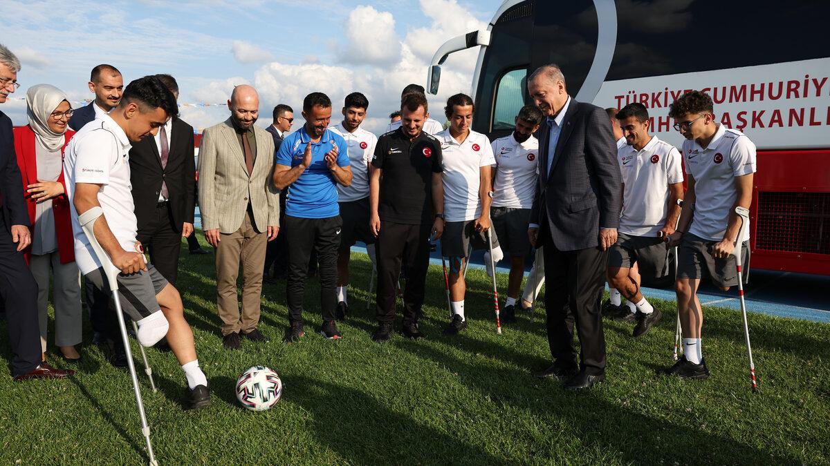 Erdoğan, "Sanayi ve Teknolojinin Merkezi Kocaeli'ye Değer Katanlar Ödül Töreni" ile "TOKİ Konutları, KYK Yurtları, Büyükşehir Belediyesi Yatırımları ve Fabrikaları ile Yapımı Tamamlanan Diğer Projelerin Toplu Açılış Töreni" için geldiği Kocaeli'de, kamp yapan Ampute Milli Futbol Takımına ziyarette bulundu.