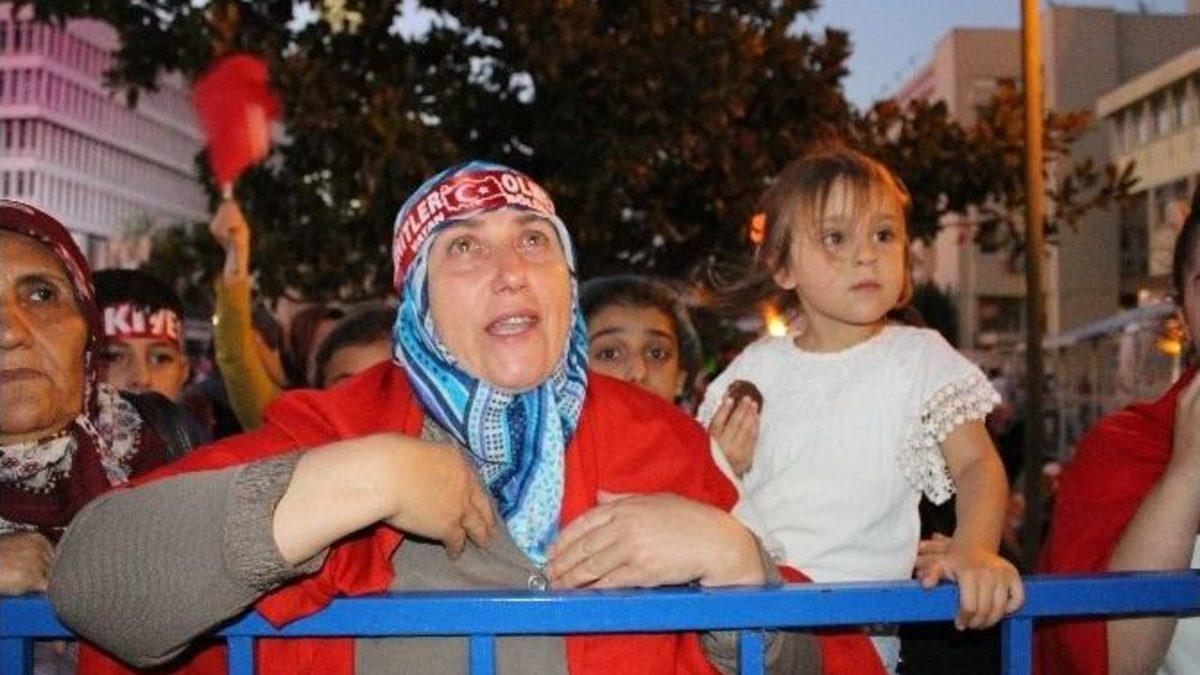Binlerce İzmirli, darbe kalkışmasının 5. gününde de alanları doldurdu. Kadınların yoğunlukta olduğu demokrasi nöbetinde gözyaşları içinde konuşan Fatma Sekmen isimli vatandaş, “O subaylar, albaylar okumuşlar ama adam olamamışlar” dedi.Cuma akşamından bu yana darbe kalkışmasına karşı demokrasi nöbeti tutan binlerce İzmirli, bugün de Konak Meydanı’nda ellerinde Türk bayraklarıyla darbeye karşı tek yumruk oldu. Demokrasi nöbetinde, kadınların darbecilere karşı tepkileri de dikkat çekti. Bazı kadınlar “İdam isteriz” sloganları attı, bazıları darbecilere karşı Cumhurbaşkanı Recep Tayyip Erdoğan’ın arkasında olduğunu söyledi. Fatma Sekmen isimli vatandaş ise, gözyaşları içinde darbecilere sert tepki gösterdi. Konuşmasında gözyaşlarını tutamayan Fatma Sekmen, “O subaylar, albaylar okumuşlar ama adam olamamışlar. Vatan hainleri onlar. Yazıklar olsun. Bizim içimiz yanıyor. Bir avuç toprak onlara nasip olmasın. Bu ülkenin toprağı onlara nasip olmasın. Ben uykusuz kapının önünde oturdum. Bayrağıma laf edenlere laf ettirmiyorum. Bu bayrak bizimdir, bu vatan bizimdir. Kimse bu vatana el uzatamaz. Başbakanımıza el uzatamaz. Cumhurbaşkanımıza laf söyleyemez” diye konuştu.“Başkomutan emretti, kadınlar olarak buradayız”Mümine Bingöl isimli kadın, “Bizi bu FETÖ’cüler dostluktan sildiler, silsinler. Öyle vatan haini olacağımıza hiç yaşamayız daha iyi. Allah onları kahretsin. Onlar askerimize polisimize el kaldırdılar” derken, Hacer Bulut ise şunları söyledi:“Başkomutan emretti, kadınlar olarak buradayız. O ‘evinize gidin’ diyene kadar da nöbete devam edeceğiz. Akşama kadar çalıştık, sabaha kadar da burada nöbetteyiz. Başkomutanım rahat ol arkandayız. Dik dur eğilme, bu millet seninle.”Öte yandan, demokrasi nöbetinde meydana kurulan dev platformda İzmir’in meşhur efeleri sahneye çıkarken, haberler de vatandaşlara izlettirildi. AK Parti İzmir İl Başkanı Bülent Delican ve 9 Eylül Üniversitesi Rektörü Prof. Dr. Mehmet Füzün’ün de bulunduğu demokrasi nöbeti, bugün de sabah saatlerine kadar sürecek.