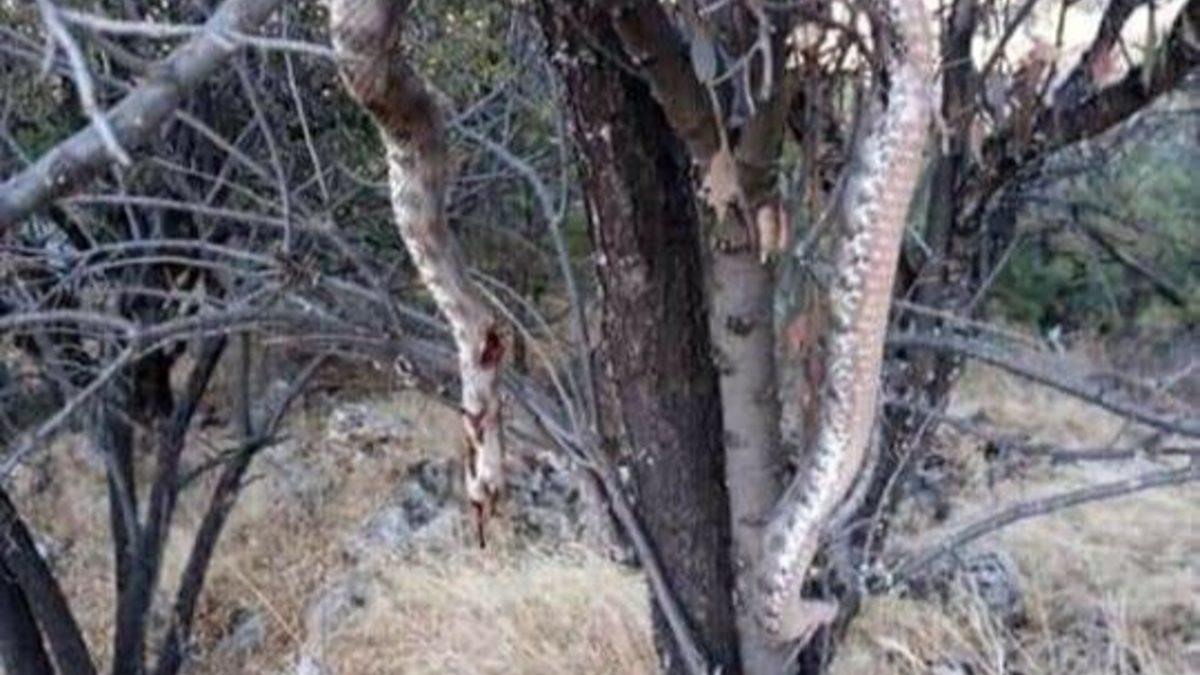 Elazığ’da kimliği belirsiz kişiler, büyük bir yılanı öldürüp ağaca astı.