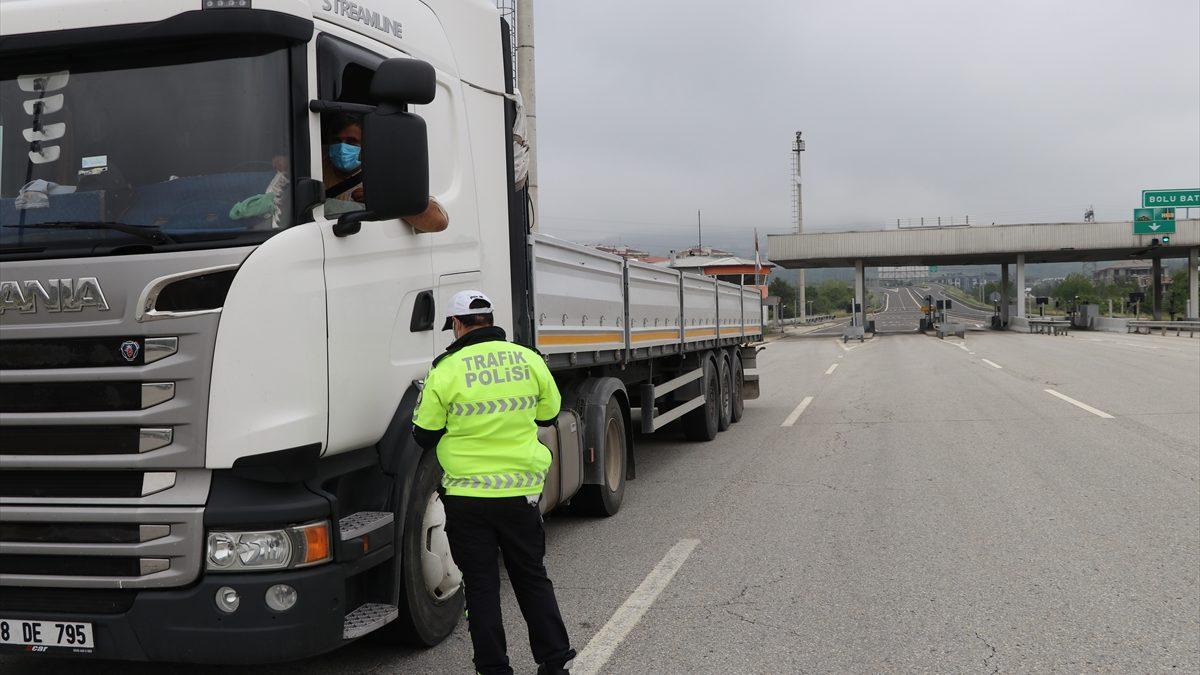 Anadolu Otoyolu'nun Batı ile Doğu çıkışlarında polis ve jandarma ekipleri, kontrol noktalarında sürücülerin seyahat izin belgelerini kontrol ederken, araçta bulunanlar maske, mesafe ve hijyen konusunda uyarıldı.