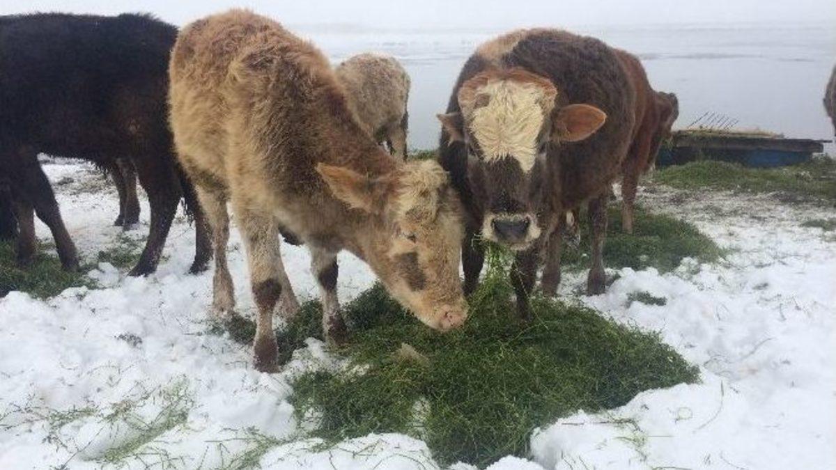 Van’ın Çaldıran ilçesindeki besiciler, kar ve dondurucu soğuklara karşı hayvanlarını Kaz Gölü Çayı’nın zemininden çıkardıkları taze otla besliyor.Çetin kış koşullarının yaşandığı Çaldıran’da besiciler, hayvanlarının yem ihtiyaçlarını Kaz Gölü’nden çıkardıkları taze otlarla sağlıyor. İlçenin 7 kilometre uzaklığındaki Kaz Gölü Çayı, geçimini hayvancılıkla sağlayan vatandaşlar için farklı anlam taşıyor. Kış mevsiminin en çetin geçtiği yerleşim yerlerinin başında gelen ve hava sıcaklığının bazen sıfırın altında 30 dereceye kadar düştüğü ilçede çiftçiler çeşitli yöntemlerle hayvanlarını besliyor. Yazın, Kalkandelen, Yassıtepe, Yağbasan, Hanköy ve Kuyucak mahallelerinden Kaz Gölü Çayı yakınlarına getirdikleri hayvanları sudaki yosunsu bitkilerle besleyen vatandaşlar, kış döneminde de suda büyüyen taze otları çıkararak hayvanların yem ihtiyacını karşılıyor. Sudaki otlar sayesinde yaz ve kış aylarında yem maliyetini düşüren besiciler, hayvanlarını sürekli taze otla besleyerek süt veriminde de artış elde ediyor.