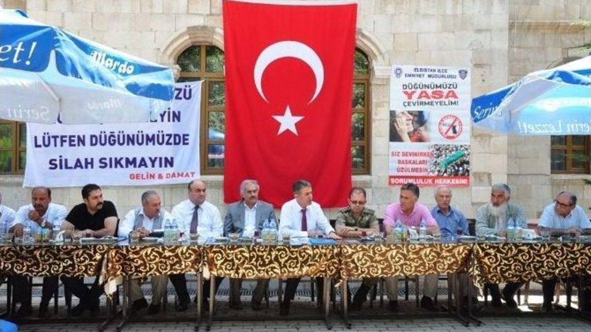 Elbistan Kaymakamı Tuncay Akkoyun, Elbistan Belediye Başkanı Durmuş Küçük, İlçe Jandarma Komutanı Binbaşı Şahin Kocaköse ve İlçe Emniyet Müdürü Barış Murat Başol ile birlikte, düğün ya da nişan gibi törenlerde havaya ateş açılması ve havai fişek atılmasının önlenmesi için siyasi parti, sivil toplum kuruluşu temsilcilerinin ve mahalle muhtarlarının katıldığı bir ‘ortak irade’ toplantısı düzenledi.Siyasi parti temsilcileri, sivil toplum kuruluşları ve muhtarlardan bu olayın önüne geçilmesi için destek ve işbirliği talep edilen toplantıda değerlendirme yapan Kaymakam Akkoyun, düğünlerde havaya ateş açılmasının kültürümüzde yer almadığını vurgulayarak, bu olayın gerçekleşmesinin insanların can ve mal güvenliğini tehlikeye düşürdüğünü ve insanların huzurunu bozduğunu kaydetti.Silah sıkılmasının ya da havai fişek atılmasının sadece emniyet tedbirleri ile çözülemeyeceğini de hatırlatan Kaymakam Akkoyun, bu olayın toplumsal sorumluluk çerçevesinde her vatandaşın katkısı ile sonlandırılabileceğine işaret etti.Kaymakam Akkoyun, silah atılmasının insanlarda kanıksamaya neden olduğunu da hatırlatarak, “Olası bir olumsuz durumda insanlar ‘nasıl olsa düğünden geliyordur’ diyerek olayı umursamayacak belki de telafisi güç durumlarla karşılaşabileceğiz” diye konuştu.Elbistan’da sosyolojik bir yara haline gelen konunun çözümüne yönelik olarak Mehmet Akif Ersoy Belediye Evi’nde muhtarlara yönelik, Polisevinde de siyasi parti ve sivil toplum kuruluşlarının temsilcilerinin katılımı ile düzenlenen toplantılarda konuşan Kaymakam Akkoyun, “Ülkemizin sorunu ve özelde de Elbistan’ımızın sorunu olan düğünlerde, nişan, kına, asker uğurlama diye tabir ettiğimiz güzel etkinliklerde kötü bir alışkanlıkla karşı karşıyayız. Toplum olarak bu olayı tasvip etmiyoruz. Bu sorunu el birliği ile güç birliği ile çözeceğiz. Sizlerin bize vereceği destek çok çok önemli. Ateşli silahlarla havaya ateş edilmesi suretiyle veya izinsiz havai fişek kullanımı var. Bu, ilçemiz için ciddi bir sıkıntı oluşturuyor. Tabanca ve benzeri silahlarla havaya ateş ediliyor, havai fişek ve benzeri ses çıkaran çeşitli maddeler izinsiz kullanılıyor. Ehil olmayan kişiler de bunları kullanıyor. Havai fişek, yanlış kullanıldığı zaman bir ya da daha fazla insanın canına mal olabilir. Bunun dışında düğünlerde diğer merasimlerde kontrolsüz konvoylar ve bu konvoylarda ateş etmek suretiyle konvoyda bulunanlarla kendisinin canına sebep olabilecek yanlış tutum ve davranışlar var” diye konuştu.Düğünde havaya ateş etmenin kasten adam öldürmeyle aynı durum olduğunu vurgulayan Kaymakam Akkoyun, “Biz, Elbistanlı değiliz ama burada yaşıyoruz. Aynı havayı teneffüs ediyoruz. Samimiyetimle söylüyorum, ben burada kendi memleketime hizmet eder gibi ediyorum. Burası, vatanına, bayrağına bağlı ve bu anlamda birliği, beraberliği ve kardeşliği tesis etmiş bir yer. Biz, böyle bir yerde bu tür sıkıntılı durumun olmasını istemiyoruz. Bizim kültürümüzde havaya ateş etmek diye bir şey yok. Bu olayın kültür diye savunulması çok yanlış. Bu dinen de yanlış bir şey. Dinen, düğünlerde havaya ateş ettiğiniz zaman birinin canına kastederseniz kasten adam öldürmeyle aynı şeydir. Bunu bile bile bu riski almak çılgınlık olsa gerek” ifadelerini kullandı.Elbistan’da düğünlerde havaya açılan ateş sonucu 1 kişinin hayatını kaybettiğini ve 4 kişinin de yaralandığını hatırlatan Kaymakam Akkoyun, şunları söyledi:“Özellikle son dönemlerde bu iş artık çığırından çıkmış vaziyette. Jandarmamız ve polisimiz çok iyi niyetli davranıyor. Defalarca uyarıyoruz, bilgilendirme yapıyoruz, düğün sahibi ile görüşüyoruz, pankartlar asıyoruz. Güvenli Düğün Projemiz devam ediyor ama en neticede ama sizin kardeşinizin canı risk altında. O düğüne katılan insanların canı tehlikede. Bunun geri dönüşü yok. Yarın çocuğunuz başına bir iş geldiği zaman eyvah demek bir işe yaramaz. Son 3 yılda düğünlerde ateşli silahlarla havaya ateş etmek suretiyle 1 kişi yaşamını yitirdi. 4 vatandaşımız yaralandı ve 13 de mala zarar verme olayı yaşandı. Bu insani olarak da, hukuken de, dinen de, ahlaken de yanlış bir şey. Bir insanın canına kastetmek kadar kötü bir şey olabilir mi? Masum insanlar zarar görüyor.Biz, kent olduğumuzu iddia ediyoruz ve uğraştığımız sorun maalesef bir kente yakışmayan sorun. Bu konunun ayrı bir boyutu daha var. Emniyet ve asayişten sorumlu güvenlik güçlerimiz bir yerde bir sıkıntılı durumla karşılaşsa askerimize, polisimize bir saldırı olsa, insanlar bu silah seslerine aşina olduğundan dolayı kimsenin haberi olmaz. Düğündür der geçer herkes. Bunun ne kadar riskli olduğunu biliyor musunuz? Bu sizin de başınıza gelebilir. Bu çok riskli bir şey. Ben, sizin bir kardeşinizim. Bu konuda vicdani sorumluluk hissediyorum. Bu işi çözelim. Artık ortak bir irade ortaya koymanın zamanı geldi.”“Yasal işlem yapmak bu işi çözmez” diyen Kaymakam Akkoyun, şöyle devam etti:“Düğünlerimize sürekli sivil polis memuru gönderiyoruz. Projeler uyguluyoruz. Şuanda talep edilen polisiye yöntemlerle bu işin çözülmesi. Bu yeterli değil. Bizim amacımız bunu herkesin sorun olarak kabul edilmesi ve kökten çözülmesi. Herhangi bir kamu görevlisi, düğününde ya da herhangi bir törende havaya ateş ettiğini öğrenirsek o memurla ilgili olarak yasal işlem yapacağız. Memurlarımız, bu durumu görüp haber vermiyorsa yine işlem yapacağız. Bu konuda yasal ve idari işlemler başta olmak üzere, ikna yöntemleri olmak üzere her yolla mücadele edeceğiz. Artık daha güçlü bir iradeyi ortaya koyacağız. Şimdiye kadar uyguladığımız yöntemle