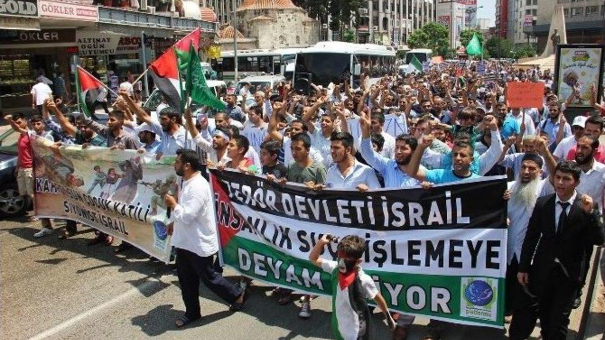 Dünya Kudüs Günü nedeniyle Adana'da çeşitli STK üyeleri, Filistin'e saldırılarını sürdüren İsrail'i protesto etmek için yürüdü.Kemeraltı Camii'nde önce namaz kılan eylemciler, ardından 5 Ocak Meydanı'nda toplandı. İçlerinde kadın ve çocukların da olduğu gruba, camide namaz kılan cemaatten bazıları da eşlik etti. Ellerinde dövizler ve kefene sarılmış bebek figürlerinin olduğu grup, İsrail ve ABD aleyhinde sloganlar atarak ve sık sık tekbir getirerek İsmet İnönü Parkı'na yürüdü. Gruptan Ekrem Özbek isimli bir kişi, Gazze'de katledilen bir bebeğin ölümünden hiçbir şeyin önemli olmadığını belirterek, bugün Dünya Kudüs Günü olduğunu ve Kudüs'ün kan ağladığını ifade etti. “Kudüs'ü sevenler de kan ağlıyor, yüreğimiz yanıyor” diyen Özbek, “Allah yüreğimizi yakanların evlerine ateş düşürsün. O siyonist katiller Gazze'den sağ olarak çıkamaz inşallah. Allah evlerin birliklerini dağıtsın. Allah onları kahrı perişan etsin. Şu Ramazan'ın son cumasında, onların toplu ölümlerini bize ulaştırsın inşallah. Bol bol dua edelim. Dua etmekle de kalmayalım, inşallah elimizden ne geliyorsa yapmaya çalışalım” diye konuştu.Kur'an okunmasının ardından konuşan Salih Demir isimli bir hoca ise saldırıları kınayıp, kıyımlar bitene kadar protestoların şiddetli biçimde sürdürülmesi gerektiğini söyledi. Grup adına basın açıklamasını okuyan Kudüs Platformu Temsilcisi İsa Emre ise yıllardan bu yana saldırıların eksik olmadığı Kudüs'ün, İslamiyet açısından önemini vurguladı. Çocukların yetiştirilirken bilinçlendirilmesi gerektiğini söyleyen Emre, “Yeni doğan çocuklarımıza ilk öğreteceğimiz kelime Allah olmalıdır. İkinci kelime Hz. Muhammed olmalıdır. Üçüncü kelime ise 'Kahrolsun İsrail' ve 'Ölüm Sana İsrail' olmalıdır.”İsa Emre, ABD ilişkilerinin derhal sona erdirilip, ABD büyükelçilerinin ülkeden kovulması gerektiğini ifade ederek, 'Sayın Başbakan'dan icraat beklemekteyiz” ifadesini kullandı. Eyleme, STK üyelerinin yanı sıra, çevredeki vatandaşların da katıldığı görüldü. Basın açıklamasının ardından grup olaysız bir şekilde dağıldı.