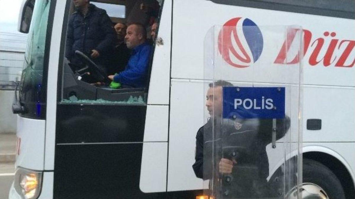 Spor Toto 3. Lig maçı sonrası Düzce’ye hareket etmek isteyen Düzcespor kafilesi Milli Egemenlik Caddesi üzerinde saldırıya uğradı. Taşlı saldırıya uğrayan otobüsün camları kırıldı, polis ekipleri alarma geçti.Spor Toto 3. Lig 1. Grup’ta Zonguldak Kömürspor’a konuk olan Düzcespor, maçtan 1-0 mağlup ayrıldı. Maç sonrası takım otobüsüne binen Düzcespor kafilesi, Milli Egemenlik Caddesi üzerinde saldırıya uğradı. Kimliği belirsiz kişilerin attığı taş parçaları şoför camını ve otobüsün yan camlarını tuzla buz etti.Otobüse saldıran ve taraftar oldukları iddia edilen kişiler olay sonrası izini kaybettirmeye çalıştı. Biber gazı ile olaya müdahale eden polisin yetersiz kalması üzerine olay yerine çok sayıda takviye ekip istendi. Otobüste bulunan futbolcular otobüsün içerisine de biber gazı geldiğini söyleyerek dışarı çıkmak istedi. Çevre güvenliğinin en üst düzeye çıkartıldığı bölgede takım otobüsü bir süre bekletildi. Polis şüpheli oldukları iddia edilen bazı kişileri gözaltına aldı.Olayın ardından trafik iki yoldan da ulaşıma kapatıldı. Gaz maskesi giyen polisler ellerindeki coplarla çevredeki kalabalığı dağıttı. Polisin müdahalesi ile ortam güçlükle sakinleştirildi.POLİSTEN ŞOFÖRE CANLI KALKANOlayda polisin yetersiz kaldığını iddia eden Düzcespor kafilesi olayı gerçekleştirenlerden şikayetçi olacaklarını belirtti. Otobüsün bölgeden uzaklaştırılması istenince şoför can güvenliğinin olmadığını söyleyerek otobüsü kullanmak istemedi. Yeniden ikna edilen şoför polis konvoyu eşliğinde Polisevi mevkiine kadar yoluna devam etti.Eline aldıkları kalkanla yaya olarak otobüse eşlik eden polisler olası yeni bir saldırıya karşı teyakkuza geçti. Polis olayla ilgili olarak 6 kişiyi gözaltına alırken Düzcespor kafilesinin başka bir otobüsle nakledileceği belirtildi.KÖMÜRSPOR BAŞKANI OLAY YERİNE KOŞTUOlayı haber alan Zonguldak Kömürspor Başkanı Av. Süleyman Caner otobüsün bulunduğu bölgeye geldi. Yönetim kurulu üyeleriyle birlikte Düzcespor kafilesine gerekenin yapılacağını belirten Caner, olay sonrası gazetecilere şu açıklamada bulundu:"Olayı biz de görmedik. Herhalde çarşı içerisinde geçişte toplanmışlar. Arabayı taşlamışlar. Ne olmuş bakacağız. İnceleyeceğiz. Görüntü varmış. Kim taş atmış bakacağız. Bu hoş olmayan bir hadise. Düzce’de tabii arabalarımızı taşladılar. Taraftarımıza eziyet ettiler ama kötü örnek alınmaz. Onlar misafir taş atsalar gülle karşılık vermemiz lazım gelir. Bizim anlayışımız, Zonguldakspor’un anlayışının bu olması lazım gelir. Ama herhalde içimizden çıkan birkaç kişi bu şeyi bozdu. Hoş olmadı. Düzcespor’a geçmiş olsun diyorum. Allah’tan başka bir şey olmadı. Gözaltına alınanlarla ilgili bilmiyorum bakacağız. Emniyete gideceğiz. Olayla ilgili ne ilgileri var bakacağız, göreceğiz."