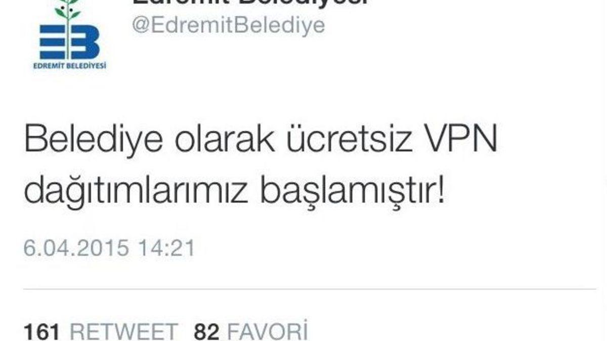 Balıkesir’in Edremit Belediyesi, Twitter ve Youtube’a erimiş yasağını, "Belediye olarak ücretsiz VPN dağıtımlarımız başlamıştır" tweet’iyle eleştirdi.Twitter ve Youtube’a mahkeme kararı ile erişimin engellenmesinin yankıları devam ederken, Edremit Belediyesi, attığı tweet ile dikkatleri bir anda üzerine çekti. Türkiye’de erişimi engellenen sosyal medya sistemlerine bağlanmayı sağlayan VPN uygulaması dağıttığını ifade eden Edremit Belediyesi, olayı mizahi bir şekilde eleştirdi. Edremit Belediyesi sosyal medya ekibi, VPN dağıtılması gibi bir uygulamaları olmadığını, sadece olaya mizahi bir yaklaşım ortaya koymak için böyle bir mesaj paylaşıldığını ifade etti. Edremit Belediyesi, bu tweet’ine, "Belediye dediğin Edremit Belediyesi gibi olur", "Anne sorun çıkarsa belediye internet erişimi sağlıyormuş uğrar alırsın", "Belediye gibi belediye", "Ya sen ne güzel belediyesin böyle" gibi destek paylaşımları aldı.