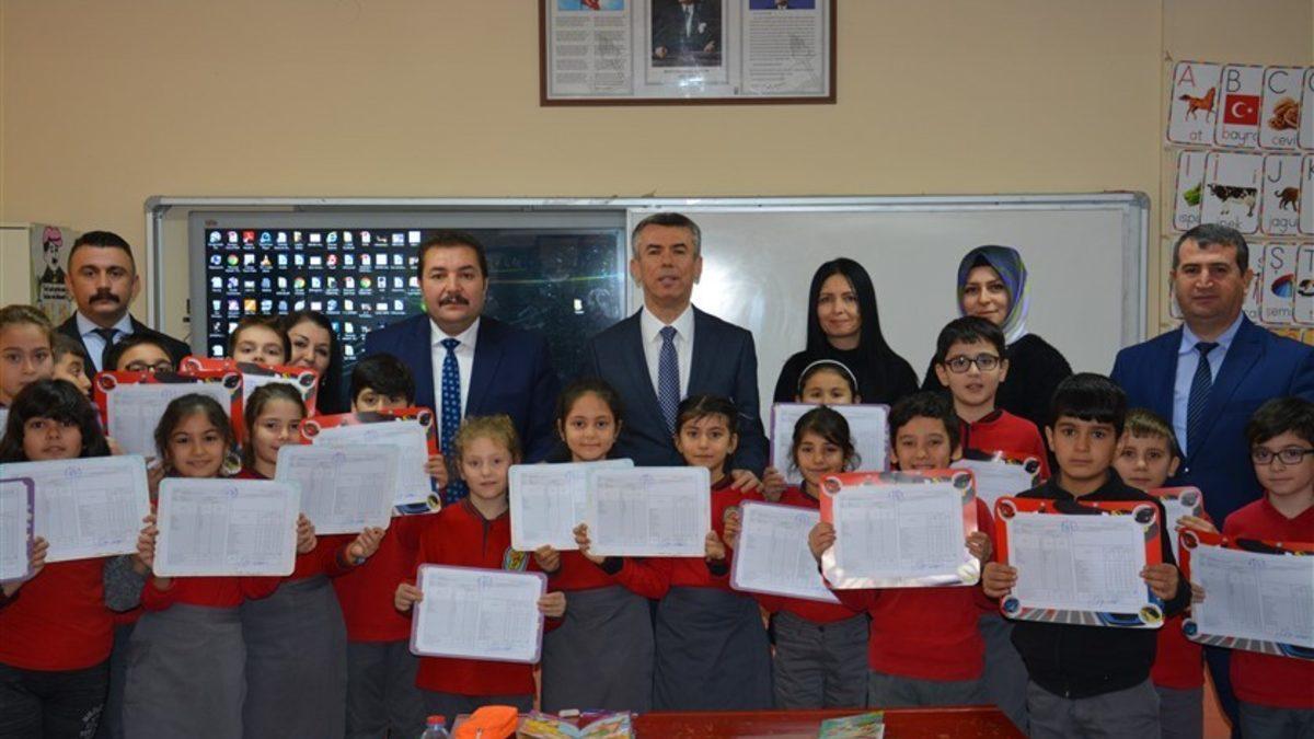 Şehit Hamdibey İlkokulu 3. sınıf öğrencilerine karnelerini vererek öğrencilerin karne sevincini paylaşan Kaymakamı Ali Sırmalı karne alan öğrencilere yarıyıl tatillerini nasıl geçireceklerini sorarak tatilde bol bol kitap okumalarını tavsiye etti.