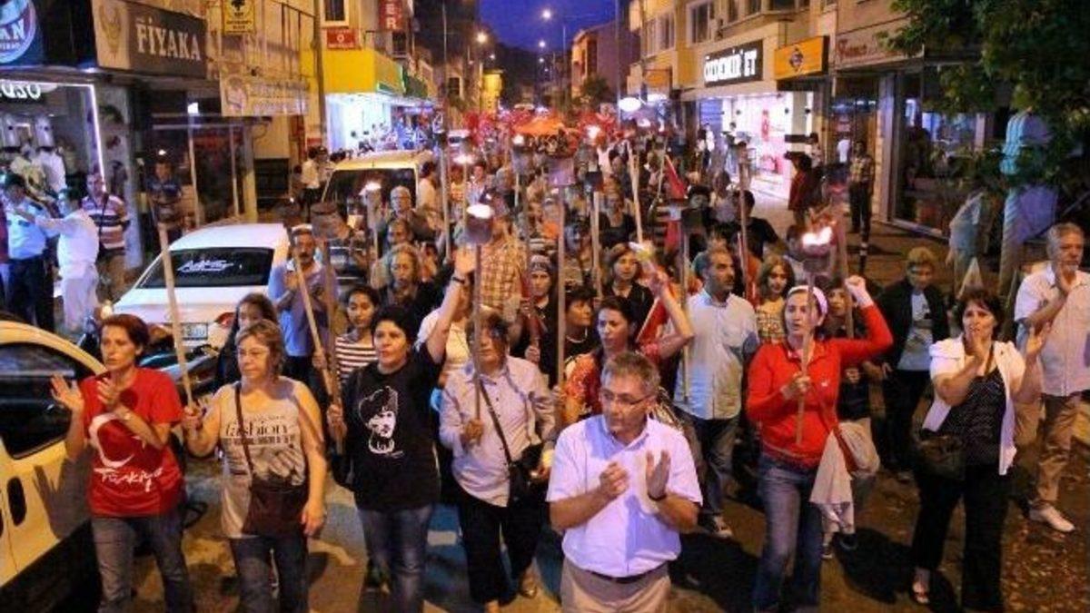 Uzun zamandır fener alayı gerçekleştirilmeyen ilçe merkezindeki fener alayı etkinliğini, ilçeye bağlı Zeytinli Belediyesi organize etti. CHP İlçe Teşkilatı ve belde teşkilatlarının da katılım desteği verdiği fener alayı, ilçenin Gümrük Meydanı’ndan başlatıldı. Ellerinde Türk bayrakları ve meşaleler bulunan ve çoğunluğunu kadınların oluşturduğu yaklaşık bin 500 kişilik grup, “Ulusal bayraklar engellenemez” şeklinde slogan attı. Dev Türk bayrağını taşıyan bayanlar, korteji evlerinden ve iş yerlerinden izleyen vatandaşlardan alkış topladı. Çalınan müzik ve 10 Yıl Marşı eşliğinde yürüyüşe geçen kortej, Çayiçi Caddesi’ni takiben Cumhuriyet Meydanı’na kadar ilerledi. Cumhuriyet Meydanı’nda son bulan yürüyüşün ardından, meydanda meşaleler yakıldı ve saygı duruşunda bulunulup İstiklal Marşı söylendi.
