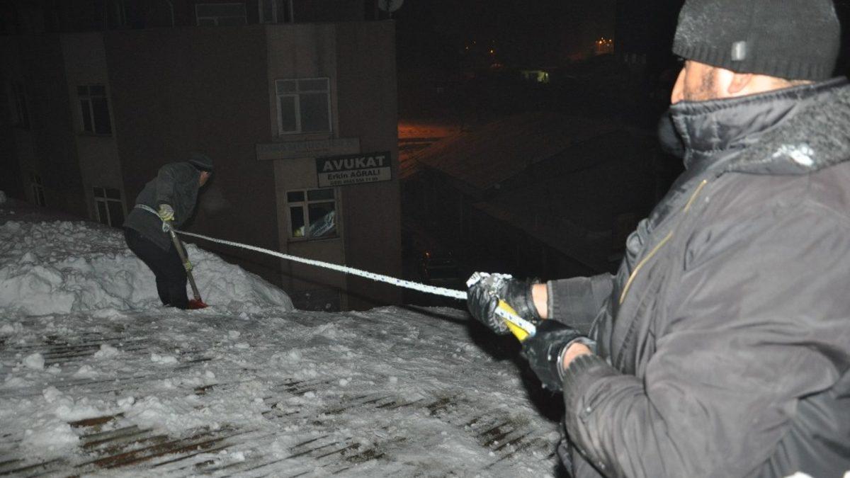 Temizlediği her çatı için 50 TL alan 3 çocuk babası Arafat Erksiz, “Biz burada çatıların karını temizliyoruz. Bugün akşamüzeri saat 5 gibi buraya çıktık. Ancak gece bire kadar kar temizleme çalışmamız biter. Burada 4 kişide çalışıyoruz, kişi başına 50 TL düşüyor. Kendimizi iplerle koruyoruz. Çok riskli bir iş, her anda düşebiliriz. Kiminin 3 veya 4- 5 çocuğu vardır. Kendimizi iplerle koruyoruz. İpleri bacaya bağlıyoruz, çokta sağlam değiller. Şimdi herkes evinde sobanın önünde ısınırken, biz ise ailemize ekmek götürmek için gece saatlerinde eksi 20’de çalışıyoruz. Çünkü başka iş olmadığı için mecburen bu işi yapıyoruz” dedi.