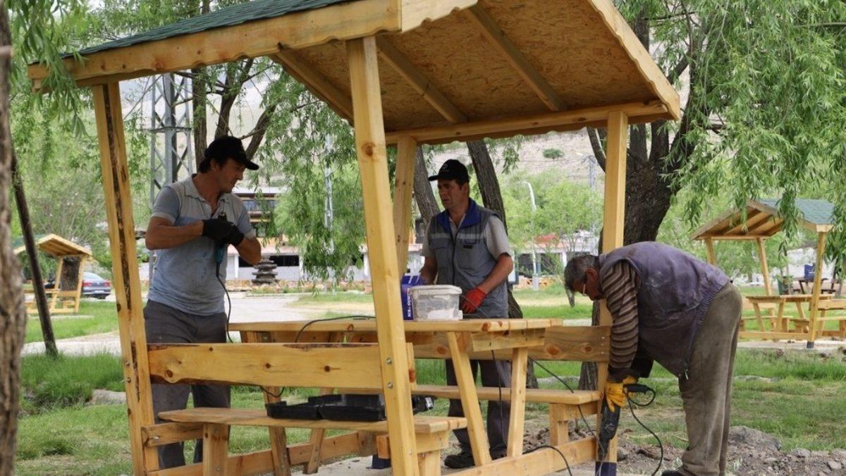 Destek Hizmetleri Müdürlüğü marangozhane personelleri ise mesire alanına tamamen Erzincan Belediyesinin üretimi olan yeni pergola ve kamelyaların kurulumunu yapıyor. Tahrip olmuş ahşap kamelya ve pergolaların tadilatını yapıp vernikliyor. Ayrıca alanda bulunan eskimiş ahşap çitlerin yerine yine Erzincan Belediyesinin kendi üretimi olan ahşap çitlerin kurulumunu gerçekleştiriyorlar.