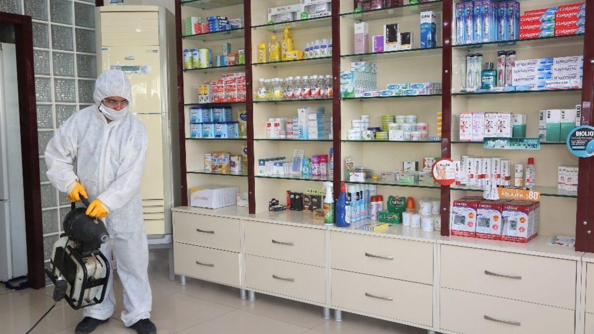Erdemli Belediyesi, korona virüse karşı başlatılan üst düzey tedbirler kapsamında ilçedeki kamu kurumlarından sosyal tesislere kadar birçok noktada ilaçlama faaliyetlerini periyodik olarak sürdürürken, eczanelerde de dezenfekte çalışması yaptı.
