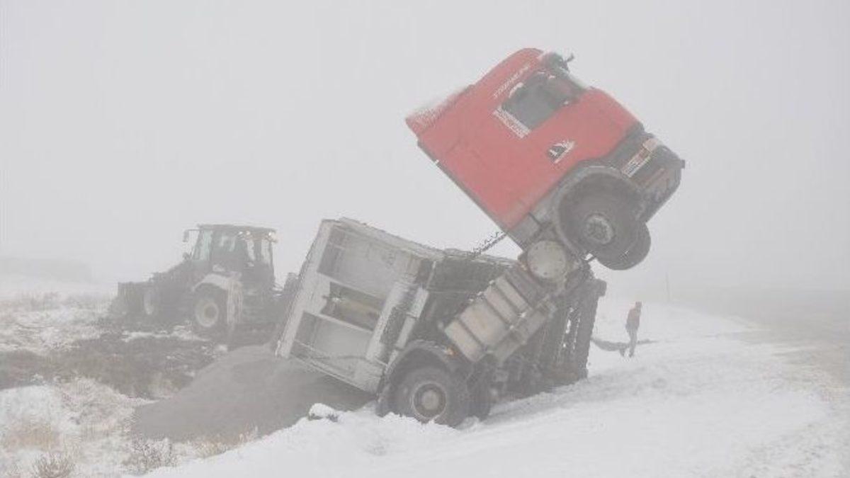 Erzincan-Sivas karayolunun Sakaltutan ve Kızıldağ mevkiinde etkisini artıran kar yağışı ve sis, sürücülere zor anlar yaşattı. Buz turan yolda kayan tır yan yatarken bölgede çalışmalarını aralıksız sürdüren karayolları ekipleri kar küreme ve tuzlama araçlarıyla karla mücadele çalışması yaptı.Erzincan-Gümüşhane karayolundaki Ahmediye geçidinde seyreden kum yüklü bir tır yolda oluşan gizli buzlanma nedeniyle kayarak şarampole yan yattı. Kazanın ardından olay yerine karayollarına bağlı ekipler sevk edildi. Tır, çalışmaların ardından şarampolden çıkarıldı. Tır sürücüsü kar yağışı nedeniyle Ahmediye zirvesine çıkamadığı için bulunduğu mevkiden geri dönüş yaptığı sırada aracının yoldan kaymasıyla şarampole yuvarlandığını belirterek, kaza sırasında yaralanmadığını söyledi.Öte yandan Erzincan İl Emniyet Müdürlüğüne bağlı trafik ekipleri ise Erzincan-Sivas karayolunun Sakaltutan mevkiinde ’kış lastiği’ denetimlerini gerçekleştirdi. Polis ekipleri Sakaltutan geçidinde kar yağışı sebebiyle araç sürücülerini durdurup, uyarılarını yaparak, sürücülerin araçlarına zincir takmalarını sağladı. Araç sürücüleri ise yapılan uygulamalardan memnun kaldıklarını belirtti.