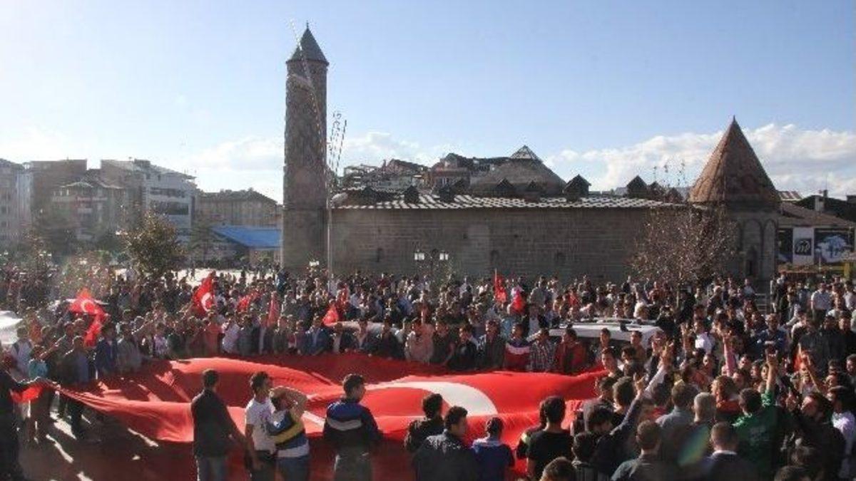 Diyarbakır’ın Lice ilçesinde yaşanan olaylar sonrasında Türk Bayrağı’nın indirilmesine tepki gösteren binlerce Erzurumlu, yürüyüş yaparak yaşananları protesto etti. Grup BDP binasının bulunduğu semte doğru yürümek isteyince polis müdahale etti.Yakutiye Kent Meydanı’nda toplanan binlerce Erzurumlu, Lice’de Türk bayrağının indirilmesini protesto etti. Havuzbaşı Atatürk Anıtı’na kadar yürüyüp burada saygı duruşunda bulunup, İstiklal Marşı okuyan grup, daha sonra Cumhuriyet Caddesi’ni trafiğe kapatarak BDP’nin bulunduğu Mahallebaşı semtine yürüyüşe geçti. Çevik kuvvet polisleri kalkanlarla set çekerek grubun önünü kesmeye çalıştı. Bu sırada polis ile vatandaşlar arasında zaman zaman arbede yaşandı. Erzurum İl Emniyet Müdürü Kamil Karabörk, MHP Erzurum İl Başkanı Zekai Kaya ve Ülkü Ocakları İl Başkanı Abdullah Kırmacı, vatandaşları sakinleştirmeye çalıştı. MHP Erzurum İl Başkanı Kaya, megafonla konuşma yaparak grubun dağılmasını sağladı.