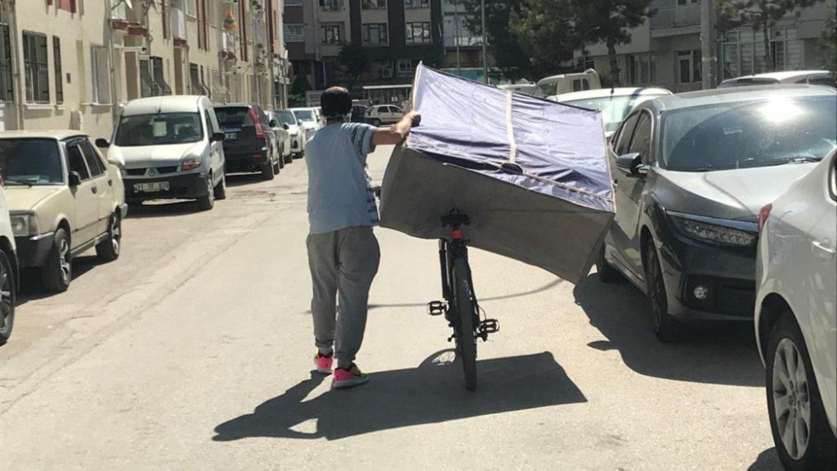 Eskişehir’de eşya taşımak için bisikletini kullanan bir vatandaş, görenleri şaşkınlığa uğrattı.