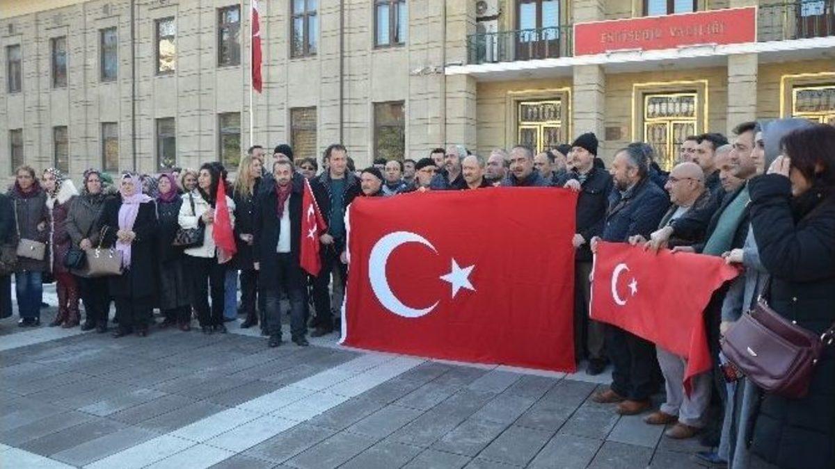 ESKİŞEHİR (İHA) – Eskişehir’de bir grup vatandaş, düzenledikleri basın açıklamasıyla terör tepki gösterdi.Cumhurbaşkanı Recep Tayyip Erdoğan’ın yanında olduklarını belli etmek amacıyla gerçekleştirecekleri “Reis yalnız değilsin” mitingini, dün akşam saatlerinde İstanbul’da yaşanan hain terör saldırıları nedeniyle başka bir tarihe erteleyen grup, basın açıklaması düzenlendi.Valilik meydanında toplanan yaklaşık 100 kişilik grup adına konuşma yapan İpek Yavuz, Cumhurbaşkanı Erdoğan’ın her zaman yanında olduklarını ifade ederek, bu milletin canını yakanların asla amaçlarına ulaşamayacaklarını belirtti. Yavuz, "Bugün burada Sayın Cumhurbaşkanımıza destek amaçlı halk olarak ‘Reis yalnız değilsin’ demek için bir miting yapacaktık. Lakin dün gece İstanbul’da yapılan hain terör saldırısı dolayısıyla, bugün ki mitingimizi ileri bir tarihe erteledik. Kandil arifesinde bu milletin canını yakanlar bilmelidirler ki, bizleri asla yıpratamayacaksınız. Ne yaparsanız yapın yeni Türkiye’yi, eski Türkiye’ye geri döndüremeyeceksiniz. Sayın Cumhurbaşkanıma burada seslenmek istiyorum, bütün dünyaya haykırıyoruz ki bugüne kadar sizi yalnız bırakmadık, bunda sonra da yalnız bırakmayacağız. Uçaklara, tanklara karşı göğsümüzü siper ettik sizi yalnız bırakmadık. Bundan sonra faiz ve döviz lobisine karşı da sizleri yalnız bırakmayacağız. Yanınızda olmaya devam edeceğiz. Yanınızda olduğumuzu fiilen de gösterebilmek için Sayın Cumhurbaşkanımız sizi Eskişehir’e davet ediyoruz. Dünyada da Müslümanlara yapılan zulme sessiz kalmayacağız. Terörü halk olarak lanetliyor, teröre destek verenleri Allah kahru perişan eylesin diye dua ediyoruz. Ülke ve millet olarak başımız sağ olsun” şeklinde konuştu.Basın açıklamasının ardından “Şehitler ölmez vatan bölünmez” sloganları atan grup Kur’an okuyup dua etti.