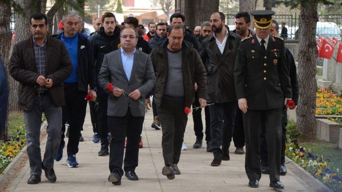Zeytin Dalı Harekatı sırasında yaralanarak tedavi gördüğü hastanede şehit düşen Piyade Binbaşı Mithat Dunca’nın vasiyeti üzerine Eskişehirsporlu oyuncular Eskişehir Hava Şehitliği’ne bir ziyarette bulundular.Eskişehir’de son yolculuğuna uğurlanan Mithat Dunca’nın vasiyeti üzerine Eskişehirsporlu oyuncular bugün şehitliği ziyaret etti. Dunca’nın, "Es Es bu sene Süper Lig’e çıkarsa mezarımı ziyaret etsinler. Erkan Zengin ve diğerleri" şeklindeki vasiyeti üzerine yapılan ziyarette duygusal anlar yaşandı. Eskişehirsporlu hemen hemen tüm oyuncuların katıldığı ziyarette Mithat Dunca’nın mezarı başında Yasin-i Şerif okundu. Edilen duaların ardından Eskişehirspor kafilesinde yer alan isimler, Dunca’nın mezarı üzerine kırmızı karanfil bıraktı.Mithat Dunca’nın eşi Lütfiye Dunca ve kızı Zeynep Naz Dunca’nın da katıldığı ziyaret sonrası açıklamalarda bulunan Eskişehirspor Sportif Direktörü İzzet Erdoğan, şehitlerin ilelebet gönüllerde yaşatılmasının gerektiğini anlattı. Eskişehirspor’un bir şehit taraftarının daha olduğunu aktaran Erdoğan, "Bu Türk milletinin zarafeti. Şehitlerimize sadece böyle günlük sahiplenme değil, ilelebet kalbimizde taşımamız lazım. Biz de takım olarak böyle acılı bir günde ailenin olmak istedik. Takım izinli olduğu için biz cenazeye katılamadık. Ondan yana biraz üzgünlüğümüz var ama bugün hem o açığı kapatalım hem aileye vasiyeti gereği desteğimizi verelim diye toplandık. Elimizden geldiği kadar yardımcı olmaya çalıştık. Tabi acı büyük olduğu için sadece sözlerin kifayetsiz kaldığı bir ortamı yaşıyoruz. Allah gani gani rahmet etsin. Kendisini tanımıyorduk ama taraftarlarımızın kalbimizde yerleri olduğu için bizim başımızın tacı. Bir şehit taraftarımızın olduğunu artık öğrendik, yerini öğrendik. Ailesine elimizden geldiği kadar bundan sonra yardımcı olacağız. Kızı bizim kızımız, kardeşimiz, eşi de bizim ablamız, bacımız. Bundan sonra elimizden gelen her türlü desteği yapacağız. Vasiyetine de futbolcularımız zaten gereken cevabı verdiler. Allah’ın izniyle önümüzdeki sene inşallah Allah bizi inşallah mahcup etmez, şampiyon olduktan sonra şehidimizin ziyaretine hep birlikte geliriz. Vasiyetini yerine getiririz" dedi.