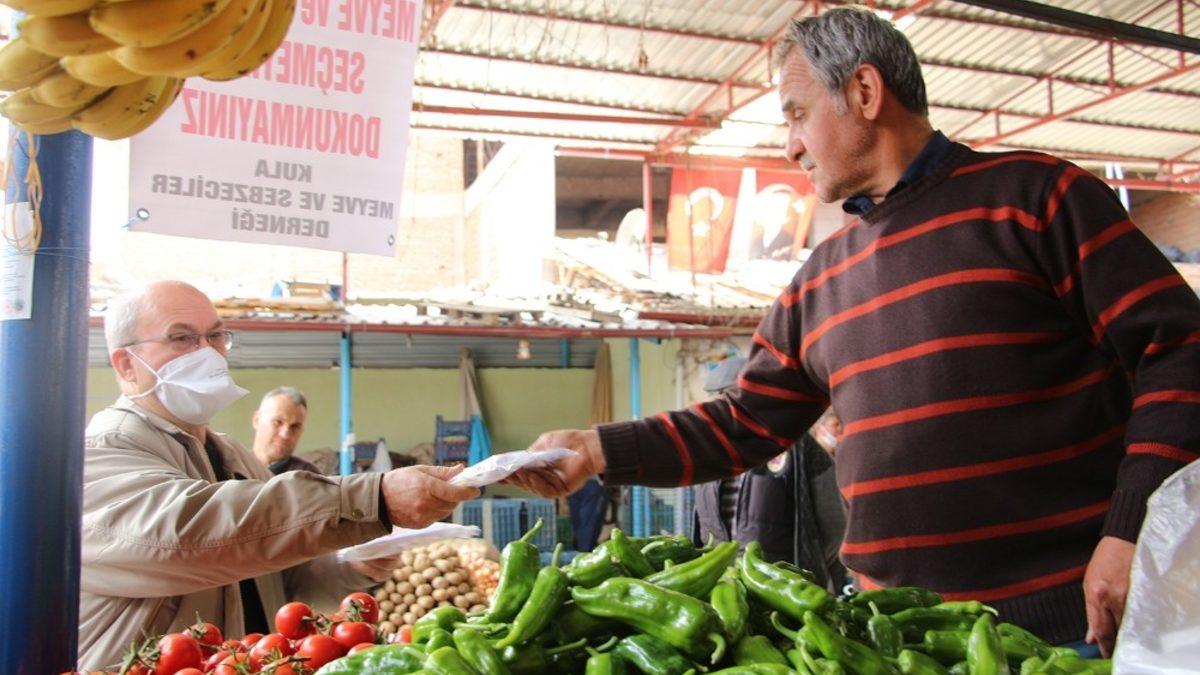 Kula Esnaf ve Sanatkarlar Kredi Kefalet Kooperatifi Başkanı Ali Yiğen, semt pazarındaki manav esnafına maske ve eldiven dağıttı.