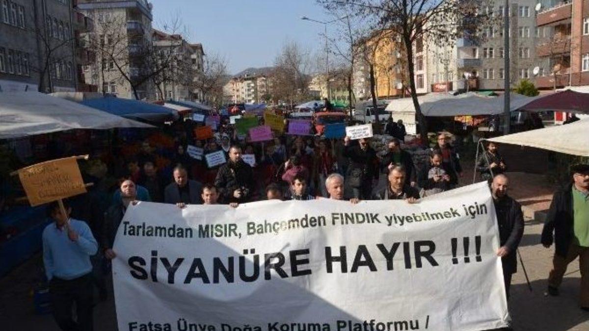 Ordu’nun Fatsa ilçesinde siyanürle altın çıkarılmasına tepki gösteren köylüler ve çevreciler eylem yaptı.Fatsa Yunus Emre Köprüsü’nde toplanan yaklaşık 500 kişilik grup, pankartlarla ’Zehirlenmek istemiyoruz’ diyerek altın çıkarılmasını protesto ettiler. Miting, Sakarya Mahallesi Yunus Emre Köprüsü’nde toplanan kalabalığın mitingin yapılacağı Fatsa Cumhuriyet Meydanı’na kadar yürümesiyle başladı. Fatsa ilçesine bağlı Yukarı Bahçeler Mahallesi Engiz mevkiinde özel bir şirket, altın çıkarmak için 100 dönüm ormanlık alandaki ağaçları keserken, şirketin açacakları kuyularda siyanürle altın ayrıştırmasına başlayacağını duyan, daha önce de eylem yapan vatandaşlar, Fatsa-Ünye Doğa Koruma Platformu önderliğinde eylemlerini sürdürdüler.’Fatsa-Ünye halkı siyanüre direniyor’, ’Siyanür katliamdır’, ’Altıncı filo defol’, ’Tarlamda mısır, bahçemde fındık yiyebilmek için siyanüre hayır’ pankartlarının açıldığı eyleme Ordu’nun yanı sıra Sinop, Samsun, Giresun, Rize ve Trabzon’dan da çevreciler katıldı.Polisin geniş güvenlik önlemi altında Cumhuriyet Meydanı’na gelen eylemciler, altın madeni çıkarmak isteyen şirketin bu girişiminden vazgeçmesini isteyerek sonuna kadar direneceklerini belirttiler. Fatsa-Ünye Doğa Koruma Platformu adına bir açıklama yapan Resul Şahin, "Herkesin desteği var. Amacımız haklı direnişimizi savunmaktır" dedi.Tertip komitesi adına basın açıklaması yapan Özge Yağcı ise, "Köylerimizde bir hayalet dolaşıyor. Ağaçlarımızı, topraklarımızı, suyumuzu yiyerek büyüyen canavar bu. Hepimizin bildiği gibi topraklarımız işgal altında. Bugün şirketin elleri değiştirilen yasa ile güçlenmiştir. Karadeniz Bölgesi’nde doğa talanlarının artmasının en büyük nedenlerinden biri de budur. Siyanürle altın arama üretimi Avrupa’da yasaklanmıştır. Toprağımızı, ekmeğimizi elimizden alıyorlar. En temel geçim kaynaklarımız yok oluyor. Fındığımız siyanürden dolayı büyük zarar görüyor. Fatsa-Ünye Doğa Koruma Platformu olarak bizler bu sürecin hukuki olarak takipçisi ve fiili anlamda da yaşam alanlarımızı talan edenlere karşı mücadelemiz devam edecek" diye konuştu.Mahalle halkından İsmet Atar ise, "Madenci şirket ne hak tanıyor ne de hukuk tanıyor. Daha siyanürlü arama başlamadan biz halka büyük zararı var. Bahçelerimizi yollarımızı talan ettiler. Yaşam alanlarımız bitti" şeklinde konuştu.Konuşmaların ardından eylemciler olaysız bir şekilde dağıldılar.