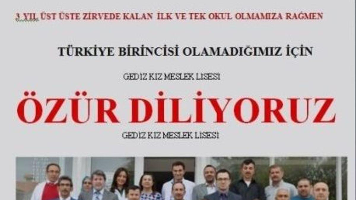 Gediz Kız Meslek Lisesi için bir alışveriş merkezine asılan ilginç özür pankartı herkes tarafından dikkat çekiyor.Cumhuriyet Caddesindeki Çarşı Alışveriş Merkezine, AVM ile Gediz Kız Meslek Lisesi Okul Aile Birliği Başkanlığınca asılan pankartta yazılanlar şu şekilde:“Gediz Kız Meslek Lisesi, Üniversiteye Öğrenci Yerleştirmede (Kendi Türünde) ve Başarı Sıralamasında 2011 Türkiye 2’ncisi, 2012 Türkiye 3’üncüsü, 2013 Türkiye 2’ncisi olmuştur.3 yıl üst üste zirvede kalan tek okul olmamıza rağmen Türkiye birincisi olamadığımız için özür diliyoruz.Başarımızın mimarı okulumuz personeline teşekkür ederiz. (Çarşı AVM - Okul Aile Birliği Başkanlığı).”Gediz Kız Meslek Lisesi Okul Aile Birliği Başkan Mehmet Ergöçmen, konuyla ilgili yaptığı açıklamada; “ÖSYM her sene mart ve nisan aylarında bir önceki yılın LYS sınav sonuçlarına göre liselerin başarı sıralamalarını yayınlamaktadır.Okulumuz Gediz Kız Meslek Lisesi bu sene ÖSYM web sitesinde yayınlanan üniversite sınavlarında başarılı okul sıralamasında kendi türünde Türkiye 2’ncisi olmuştur. Geçen sene Türkiye 3’üncüsü, bir önceki senede Türkiye 2’ncisi olmuştu.3 yıl üst üste Türkiye derecesi yapan okulumuz başarının tesadüfi olmadığını, sistemli çalışmanın ürünü olduğunu kanıtlamıştır. Okulumuz 3 yıl zirvede kalan ilk ve tek okuldur. Bu sene öğrencilerimizin üniversite sınavları başarılı geçti. Hedefimiz Türkiye birinciliğidir. Esnafımızın yoğun isteği üzerine Gediz merkezine pankart asarak sevincimizi Gediz halkı ile paylaştık.Gediz’imizi Türkiye’de başarıları ile adını duyurarak en iyi şekilde temsil eden; başta Okul Müdürümüz Mustafa Aslan olmak üzere tüm personeli başarılarından dolayı kutluyorum” dedi.(MA-EFE)