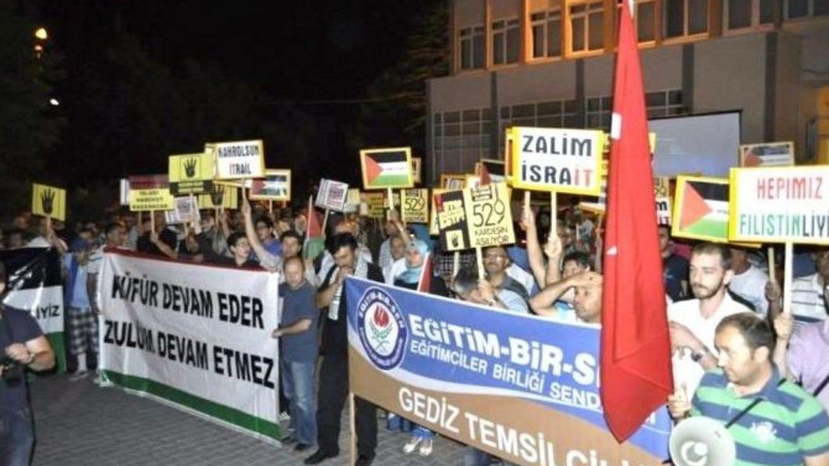 Kütahya’nın Gediz ilçesinde, Filistin’in Gazze Şehrinde yaşanan İsrail zulmü öğretmenler ve vatandaşlar tarafından protesto edilerek lanetlendi.Yaklaşık iki yıl önce belediye meclisi kararıyla Filistin’in Gazze kenti ile kardeş şehir ilan edilen Gediz’de, İsrail’in Gazze’de sürdürdüğü kanlı eylemler lanetleniyor.Eğitim-Bir-Sen (Eğitimciler Birliği Sendikası) Gediz Temsilciliğine bağlı bir grup öğretmen, İsrail’in Gazze’deki kanlı eylemlerine protesto ederek derhal son vermesini istedi.Ellerindeki pankartlarla Gediz Belediye Hizmet Binası önüne gelen öğretmenler, Belediye Başkanı Mehmed Ali Saraoğlu (AKP), Ak Parti İlçe Başkanı Eflatun Coşar ve kendilerine destek veren yaklaşık 2 bin kişi ile birlikte İsrail’in Gazze’de yaptığı katliamı lanetlediler.Mitingde bir basın açıklaması yapan Eğitim-Bir-Sen Gediz Temsilcisi Ali Arısoy, terör devleti İsrail’in Ramazan ayında yeni bir kuşatma ile tekrar çocuk katliamlarına başladığını söyledi.Filistin topraklarından yükselen acı, feryat, gözyaşı ve katil devlet İsrail’in döktüğü Müslüman kanlarının bir kez daha yürekleri yaktığını belirten Eğitim-Bir-Sen Gediz Temsilcisi Ali Arısoy, şu şekilde devam etti.“Katil ülke, sivillerin üstüne bomba yağdırıyor, küçük çocukları katlediyor, camiden çıkan insanlara kurşun yağdırıyor. İsrail’in devlet terörüne sessiz kalan Batı dünyası ile İsrail’in en büyük hamisi Amerika başta olmak üzere diğer uluslararası camianın tepkisiz kalması her yönüyle utanç vericidir. Mahzun ve masum Gazzeli kardeşlerimize vahşice bomba yağdıran İsrail, zulme maruz bırakılan da Müslümanlar olunca, sessiz kalan batı, ikiyüzlü olduğunu bir kez daha belgelemiştir. AB ülkelerinden bazıları ve ABD öldüreni değil, öleni kınamışlardır. İsrail’i kınayacaklarına Filistin tarafını kınadıklarını açıklamışlardır. Bu tam bir komedi, rezalet, kepazeliktir.İsrail’in saldırıları karşısında birlikte hareket etmeyi başaramayan İslam ülkelerinin bu tutumu siyonistleri cesaretlendirmektedir. Müslüman ülkelerin başında İsraillin güvenliğini tehlikeye atmayacak işbirlikçi kişiler yönetime getirilmektedir. Bunu en son Mısır’da gördük. Filistin halkını korumak için İsrail’in yarı açık cezaevi haline getirdiği Gazze’yi ambargoyu kaldırarak safının Gazzeli kardeşlerden yana olduğunu gösteren Cumhurbaşkanı Mursi’ye darbe ile görevinden uzaklaştırılıp yerine gelen işbirlikçi Sisi ise ilk icraatı kendisini iktidar yapan efendilerine bağlılığını göstermek için Gazze halkına ambargo uygulamak olmuştur. İsrail’in Gazze’de uyguladığı bu sindirme, yarı açık cezaevi uygulamasının üzerine 1-2 yılda bir tekrarladığı katliamlar ve her gecen gün biraz daha toprağını işgal etmesi ile 20 yıl sonra belki Gazze diye bir yer kalmayıp sıra ise bu katliamlara ve işgallere ses çıkarmayan diğer işbirlikçi Müslüman ülkelere gelecektir. Bu tehlikeyi gördükleri halde hala sessiz kalan Müslüman alemini harekete geçmeye Gazze’de yaşanan katliama seyirci kalmamaya, sıranın bize geldiği gün ağlamamak ve katil devlet İsrail’in saldırılarını durdurmak için gerekli girişimleri başlatmaya çağırıyoruz. Yaşananları Gazzeli çocuklara, Müslüman kardeşlerimize acıyarak değil, kendimize acıyarak değerlendirmemiz gerekiyor. Bugün yaşananlar sadece katil İsrail’in çocukları öldürmesinden ibaret değil. Bu durum İslam medeniyeti ile batı medeniyetinin mücadelesidir. ABD’nin, AB ve İslam ülkelerinin gözü önünde vaat edilmiş topraklar uğruna bir çirkeflikle İsrail planlarını hayata geçiriyor.Gazze halkına uygulanan bu katliama dur demek vicdan sahibi herkes için bir insanlık görevidir. Bu nedenle Gazze’deki vahşetin bir an önce durdurulması için sesimizi yükseltmeliyiz. Gün birlik günüdür. Mescid-i Aksa ve Kudüs için ayağa kalkma, kardeşlerimize sahip çıkma vaktidir. Hepimizin onurunu korumak için şehit düşen kardeşlerimizin yanında olma vaktidir Gün inzivadan uyanma günüdür. İsrail planlı katliamlarını, cinayetlerini işlemeye devam ederken tarafsız kalmak kabul edilemez bir davranıştır. Biz tarafız. Tarafımız insanlık. Zalimlerin karşısında, mazlumların yanındayız. Ayağa kalk Türkiye. Ayağa kalk ey insanlık. Bu insanlığın onur sınavıdır. Gün Filistin için dayanışma günüdür.”Gediz Belediye Başkanı Mehmed Ali Saraoğlu da, basın açıklamasında söz alarak, “Kardeş kentimiz olan Gazze’ye yapılan zulüm yüreklerimizi yakmaktadır. İki yıl önce ziyaret ettiğim Gazze’de halkın çok zor şartlarda hayatta kalma mücadelesi verdiğini görmüştüm. Şimdiki durumu düşünmek bana daha çok acı veriyor. Bizi burada toplayarak basın açıklaması ile tepkimizi dile getiren Eğitim Bir-Senli öğretmen arkadaşlara teşekkür ederim” dedi.Mitingde, Gazze’de ölenler için gıyabi cenaze namazı kılındı ve dualar okundu. (MA-EFE)