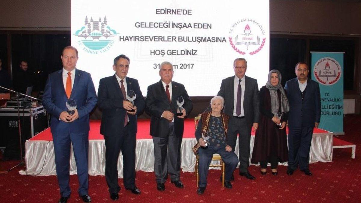 Edirne’de, okul yaptırarak eğitime katkı sunan hayırseverler unutulmadı. İl Milli Eğitim Müdürlüğü koordinesinde gerçekleştirilen ‘İsmiyle Müsemma Projesi’ kapsamında kent genelinde okul yaptıran hayırseverler için plaket takdim töreni düzenlendi.Edirne Lalezar Tesisleri’nde gerçekleştirilen İsmiyle Müsemma Projesi kapsamında, "Edirne’de geleceği inşa eden hayırseverler buluşmasına" Edirne Valisi Günay Özdemir olmak üzere, İl Milli Eğitim Müdürü Hakan Cırıt, Edirne Ticaret Borsası Başkanı Özay Öztürk, ETB Meclis Başkanı Fedai Canım, AK Parti İl Başkanı İlyas Akmeşe ve hayırseverler katıldı.Edirne İl Milli Eğitim Müdürü Hakan Cırıt programda yaptığı konuşmada, "Bu millet nerede birlik, orada dirlik, bir elin nesi var, iki elin sesi var diyerek, bir olmanın, iri olmanın, diri olmanın, birbirinin derdine derman olmanın bir çabası içerisindedir" dedi."İnsanlığın geleceğine yatırım yaptınız"Edirne Valisi Günay Özdemir de "İnsanlığın geleceğine yatırım yaptınız. Eğitim alanında yapılan bütün yatırımlar aslında insanlığın geleceğine yapılan yatırımlar ve en önemli yatırımlar. Devlet olarak biz tabi kamu yatırımları yapmaya çalışıyoruz. Ama asıl değerli ve önemli olan devletin yanında sizlerin sosyal sorumluluk anlayışı içerisinde bu yatırımları gerçekleştirmeniz" ifadelerini kullandı.Konuşmaların ardından il genelinde okul yaptıran hayırseverlere teşekkür plaketleri takdim edildi. Programın sonunda hayırsever bir iş adamı ve eşi Vali Özdemir’e Türk bayrağı hediye etti.