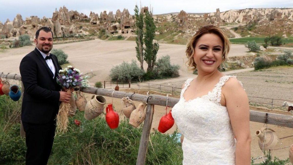 Türkiye’nin önemli turizm merkezlerinden Kapadokya bölgesi son yıllarda evlenen çiftlerin gözde mekanı olmaya devam ediyor.Türkiye’nin önemli turizm merkezlerinden Kapadokya bölgesi, yeni evlenecek ve balayı çiftlerinin fotoğraf mekanı olmaya devam ediyor. Dünyanın çeşitli ülkelerinin yanı sıra Türkiye’nin de çeşitli illerinde evlenen çiftler dış mekan fotoğraflarında tercihlerini Kapadokya bölgesinden yana kullanıyor. Peribacalarıyla ünlü Kapadokya’da fotoğraf çektirmek için gelen çiftler doğal fotoğraf platformunda büyülenmeye devam ediyorlar.Mersin’den Kapadokya bölgesine düğün öncesi fotoğraf çektirmek üzere gelen Sinem Özmen Berber Tuğral Berber çiftçi bölgede uzun zamandır fotoğraf çektirmek istediklerini ancak bugüne kısmet olduğunu belirtti. Gelin Berber, “Buralarda dış mekan fotoğrafların çok güzel olduğunu bildiğim için uzun süredir fotoğraf çektirmek istiyordum. Bugüne kısmetmiş. Yağmurlu bir hava ile çok güzel bir anımız oldu” dedi. Damat Tuğral Berber de, “Biyoloji öğretmeniyim, Mersin’den geliyorum. Buranın güzel atmosferinden dolayı burada dış mekan fotoğrafı çektirmek istedik. Havanında bulutlu olması güzel bir atmosfer kattı. Buraları gördükten sonra daha da muhteşem olduğuna karar verdim” diye konuştu.Avanos’ta fotoğrafçılık yapan Orçun Yıldırım ise Türkiye’nin hemen hemen her şehrinden gelin damat fotoğrafı çektirmek için geldiklerini ifade ederken, dünyanın çeşitli ülkelerinden de sırf gelin damat fotoğrafı çektirmeye gelen turistlerin olduğunu söyledi. Yıldırım, “Bölgemiz destinasyon olarak gelin damat fotoğraflarında çok güzel bir detay veriyor. Bundan dolayı da Türkiye genelinden ve yurt dışından gelin damatlar bölgemizi tercih ediyorlar. Bizler de elimizden geldiğinde güzel kareler yakalamaya çalışıyoruz. Kapadokya’mız zaten doğal fotoğraf platformu olduğu için her türlü manzara eşliğinde fotoğraflar çekiyoruz. Gelin, damat, balayı çiftleri bölgemizi tercih ediyorlar. Özellikle balayı çiftleri gelinlik ve damatlıklarını yanlarında getirerek bölgenin eşsiz güzelliğinde fotoğraf çektirmek istiyorlar” şeklinde konuştu.