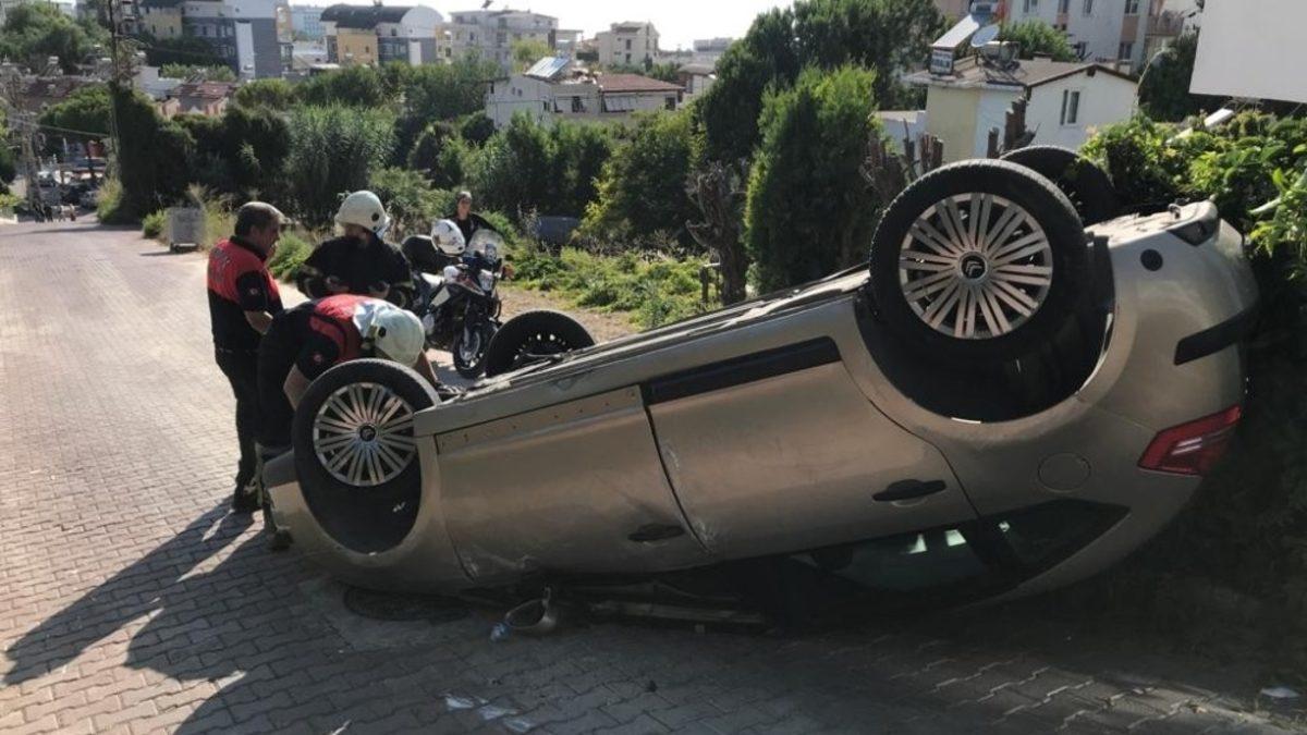 Aydın’ın Kuşadası ilçesinde otomobili ile geri manevra yapmak isteyen sürücü mesafe ayarını yapamayınca takla attı. Mahalle sakinlerini şaşırtan kazayı sürücü hafif yaralı olarak atlattı.