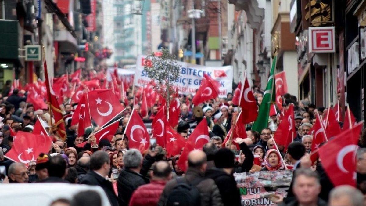 Türk Silahlı Kuvvetleri’nin (TSK) Suriye’nin Afrin bölgesinde başlattığı ‘Zeytin Dalı Harekatı’ na destek olmak için yaklaşık bin 500 Giresunlu ellerinde Türk bayrakları ve zeytin dalları ile yürüyüş gerçekleştirdi.Memur-Sen tarafından organize edilen ve Giresun’da faaliyet gösteren birçok sivil toplum kuruluşunun da (STK) destek verdiği yürüyüş Yeniyol mahallesinden başlayarak Atatürk Meydanı’nda son buldu. Yürüyüşe Bulancak Belediyesi Mehter takımı da eşlik etti. Slogan, tekbir ve ellerinde bayraklarla yürüyen kortej yürüyüş sonunda Atatürk Meydanı’nda toplanarak basın açıklaması düzenledi.STK’lar adına basın açıklamasını okuyan Memur-Sen Giresun İl Temsilcisi Sami Şimşek, asker ve devletin yanında olduklarını ifade etti. Kahraman bir ecdadın torunları olduklarını belirten Şimşek, “Mehmetçiğimiz göğüs göğse hain terör örgütleri ile iş birlikçi ağabeyleri ile mücadele ederken bizler kahraman bir ecdadın torunları olarak boş duramazdık. Kahramanlık destanları yazan hain terör örgütlerine ortalığı dar eden Mehmetçiklerimiz için buradayız. Jandarma Özel Harekatla, Polis Özel Harekat’ın kahramanları Mehmetçiklerimizle omuz omuza destanlar yazmak için yol almışken bizlerde kahraman bir ecdadın torunları olarak görev verildiği takdirde gönüllü özel harekat ordumuzu kurarak devletimizin emrinde olduğumuzu buradan ifade etmek istiyoruz” dedi.Basın açıklamasının ardından Afrin’de Zeytin Dalı Harekatı’nda şehit olan askerlerin isimleri okunarak yoklama alındı.