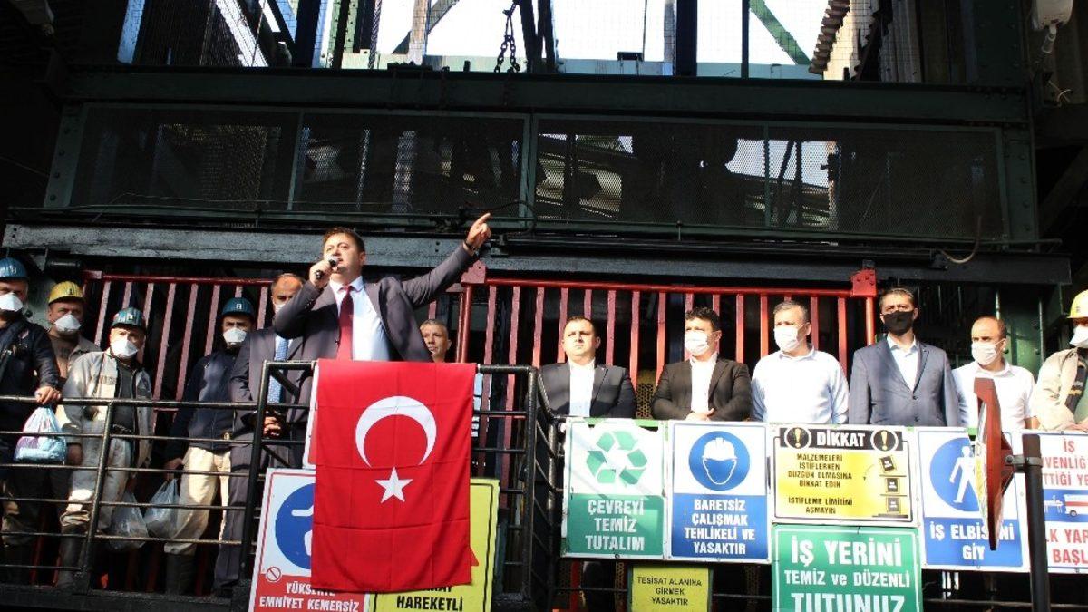 Üzülmez Kuyu başında madencilere hitap eden GMİS Genel Başkanı Hakan Yeşil, Koronavirüs salgınıyla ilgili gelişmeler ve alınması gereken önlemler ve yeniden gündeme getirilen kıdem tazminatı konularında madencilere bilgi verdi.