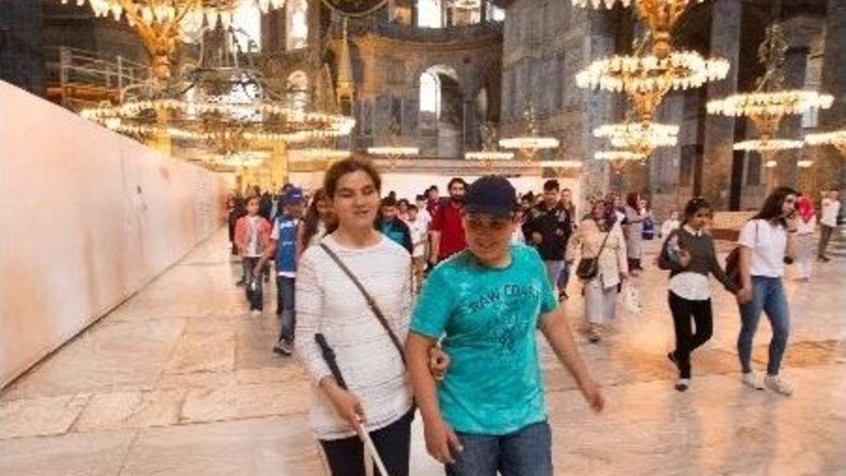 ’Engelsiz Eğitim Programı’ kapsamındaki görme engelli öğrenciler, İstanbul’un tarihi mekanlarını gezdi. Öğrenciler, tarihi yapıların duvarlarını, sütunlarını ve işlemelerini dokunarak hissetme fırsatı yakaladılar.Turkcell’in özel eğitime ihtiyacı olan engelli çocuklar için Milli Eğitim Bakanlığı himayesinde 2015 yılında başlattığı ’Engelsiz Eğitim Programı’nda eğitim gören öğrenciler, İstanbul’da tarihi mekanları dolaştı. Görme engelli öğrenciler Dolmabahçe Sarayı, Topkapı Sarayı, Ayasafya Camisi ve Sultanahmet Meydanı’nda tarih yolculuğuna çıktı. Gezi boyunca bir rehber eşliğinde göremedikleri yerlerin bilgilerini alan öğrenciler tarihi yapılara dokunarak hissetmeye çalıştılar.Görme engelli öğrencileriyle geziye katılan Hatice Öğretmen, gezi sırasında yanlarında gezilen yerleri anlatan birileri olmadığı zaman sadece yürüdüklerini belirterek " Biz bugün sarayları gezeceğiz. Sarayların içinde herşey camların içinde saklı dokunamıyoruz onlara. Bunları birinin anlatması gerekiyor" şeklinde konuştu. Çocukların gezerek tarihi canlı canlı duyacaklarını ifade eden Hatice Öğretmen, "Eğitimde teorinin çok etkili olduğunu düşünmüyorum. Eğitimde uygulama daha etkilidir. Çocuklar şimdi sarayları gezerek müzeleri gezerek tarihte neler olduğunu birebir duyarak öğrenmiş olacaklar" dedi.Eğitim verirken sesli materyaller kullandıklarını dile getiren Hatice Öğretmen, "Bilgisayarımızda konuşan programlar var. Kabartma yazı kullanıyoruz. Bütün kitapları kabartma olarak elde edemediğimiz için teknolojinin bize çok faydası oluyor. Bakanlığımız ile Turkcell’in birlikte yapmış olduğu projeyle okulumuza bir teknoloji sınıfı kazandırıldı. Bu teknoloji sınıfıyla da çocuklarımız istedikleri gibi araştırma yapabiliyorlar. İstedikleri videoyu izleyebiliyorlar" ifadelerini kullandı.Geziye katılan öğrenciler ise tarihi yerleri gezmenin mutluluğunu yaşadıklarını belirterek yeni bilgiler öğrendiklerini söylediler.