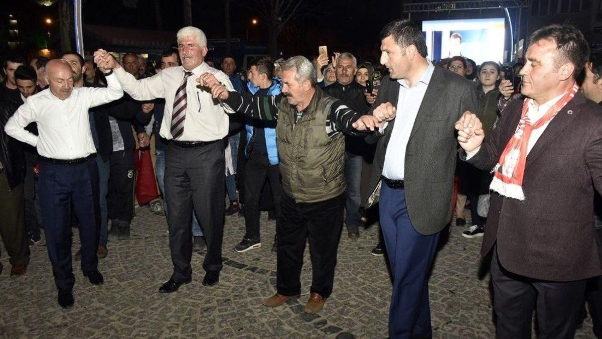 Kesin olmayan resmi sonuçlara göre anayasa değişikliği halk oylamasında yüzde 75,2’lik oranla Türkiye genelinde en çok Evet oyu veren 4.il olan Gümüşhane’de AK Parti ve MHP’lilerin katılımıyla sevinç gösterileri düzenlendi.Seçim sonuçlarının belli olmasının ardından Belediye Başkanlığı binası önünde toplanan AK Parti ve MHP’liler ellerindeki Türk bayraklarıyla çalan müziklere eşlik eden vatandaşlar zaman zaman “Başkan Erdoğan” sloganları attı.AK Parti Gümüşhane Milletvekili Hacı Osman Akgül, Belediye Başkanı Ercan Çimen, AK Parti İl Başkanı Av.Celalettin Köse, MHP İl Başkanı Nadim Aydın’ın el ele çalan davul-zurna eşliğinde yöresel halk oyunlarını oynadığı programda alana kurulan dev ekrandan Türkiye genelindeki seçim sonuçları anbean aktarıldı ve Başbakan Binali Yıldırım’ın konuşması dinlettirildi.Milletvekili Hacı Osman Akgül’ün başı çektiği halay dakikalar boyunca alanda bulunan vatandaşlar tarafından ilgiyle izlenirken, alanda ayrıca Dombra, Türkiyem gibi parçalar çalındı.“Siz bütün dünyaya karşı mücadele verdiniz”Kurulan platformda halkı selamlayan AK Parti Gümüşhane Milletvekili ve TBMM Çevre Komisyonu Başkanı Cihan Pektaş, “Dua” şiiriyle tamamladığı ve alanda bulunanların hep bir ağızdan “Amin” dediği konuşmasında, “Gümüşhane yine en önde. Büyüksün Gümüşhane, süpersin Gümüşhane. Bütün Batı karşımızdaydı. Hepsi hayır kampanyası için çalıştılar. Türkiye’deki maşaları terör örgütleriyle karşımıza çıktılar. Siz bütün dünyaya karşı mücadele verdiniz. Siz bugün hepiniz Malazgirt’te Alparslan’dınız, cenk meydanını haçlılara dar eden Kılıç Arslan’dınız, Niğbolu’da Yıldırım, Mohaç’ta Süleyman’dınız, 15 Temmuz’da hepiniz birer aslandınız. Bugün tarih yazdınız. Siz Batı başkentlerini, Vatikan’ı yasa mateme boğdunuz. Mekke, Medine, Kudüs, Bağdat’ı, Balkanlar’ı, Bakü, Buhara, Semerkand’ı sevindirdiniz” dedi.“Bugün bazı ülkelerde, Kandil’de, ABD’de, Almanya’da, Hollanda’da, Fransa’da, İsrail’de yas ilan edilecek”AK Parti Gümüşhane Milletvekili Hacı Osman Akgül de sonuçların gönül coğrafyasındaki tüm mazlum milletlere hayırlı olmasını diledi. Akgül, “Her şeyden önce bugün bazı bölgelerde, bazı ülkelerde, Kandil’de, ABD’de, Almanya’da, Hollanda’da, Fransa’da, İsrail’de yas ilan edilecek inşallah. Onlar bugün bayraklarını yarıya indirecek. Ama mazlum milletlerin yaşadığı gönül coğrafyamızda bu gece sabaha kadar sizler gibi kutlamalar yapılacak. Yarından itibaren Türkiye prangalarından kurtulmuş, hızla büyümesine devam edecek ve bu dünyadaki sömürü ve kapitalist düzeni artık fitili çekilmiştir son bulacaktır. Bunun fitilini bugünkü oylarınızla sizler ateşlediniz” dedi.Gümüşhane Belediye Başkanı Ercan Çimen ise konuşmasında, “Hepinize teşekkür ediyorum. Sizler milli iradeyi, geleceğinizi seçtiniz. Bir olacağız, iri olacağız, kardeş olacağız, hep beraber Gümüşhane olacağız, Türkiye olacağız” ifadelerini kullandı.“Bu zafer sizlerindir, aziz Türk milletinindir”AK Parti İl Başkanı Av.Celalettin Köse de Üstad Necip Fazıl Kısakürek’in "Surda bir gedik açtık" şiirinden okuduğu pasajla başladığı konuşmasında, “Bu zafer sizlerindir, aziz Türk milletinindir. Cumhurbaşkanlığı hükümet sistemi halk oylaması sonuçları ülkemize, aziz milletimize ve Türkiye 4.lüğü Gümüşhanemize hayırlı olsun. Bu birlik ve beraberliğimizi muhafaza ettiğimiz müddetçe inşallah bu milletin sırtını yere getirmeye çalışan yedi düvel başarılı olamayacaktır. Sizlere teşekkür ediyoruz” diye konuştu.MHP İl Başkanı Nadim Aydın, İstiklal Marşı’nın sözlerini okuyarak başladığı konuşmasında, “Gözün aydın Türkiye, gözün aydın Türk İslam alemi, gözün aydın Turan, gözün aydın Kızıl Elma. Hüzün sana Almanya, hüzünlen sen Hollanda, PYD, PKK, IŞİD, FETÖ. Bu ülke için ettiğimiz yeminin arkasında duracağız” dedi.Konuşmaların ardından çalan müzik eşliğinde alanda bulunanlar hem horon oynadı hem de davul zurna eşliğinde halay çekerek olaysız şekilde dağıldı.