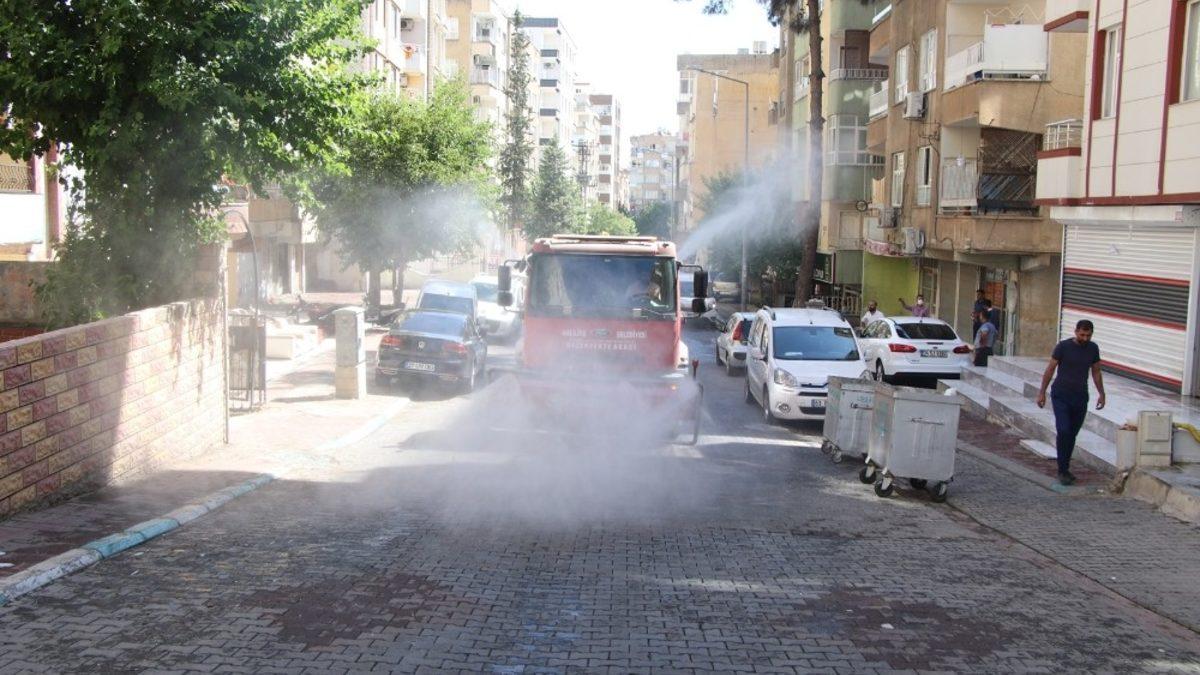 Haliliye Belediyesi temizlik ekipleri, bayramda da cadde ve sokakları köpüklü su ile yıkayarak, dezenfekte aracı ile gül suyu serpmeye devam ediyor.