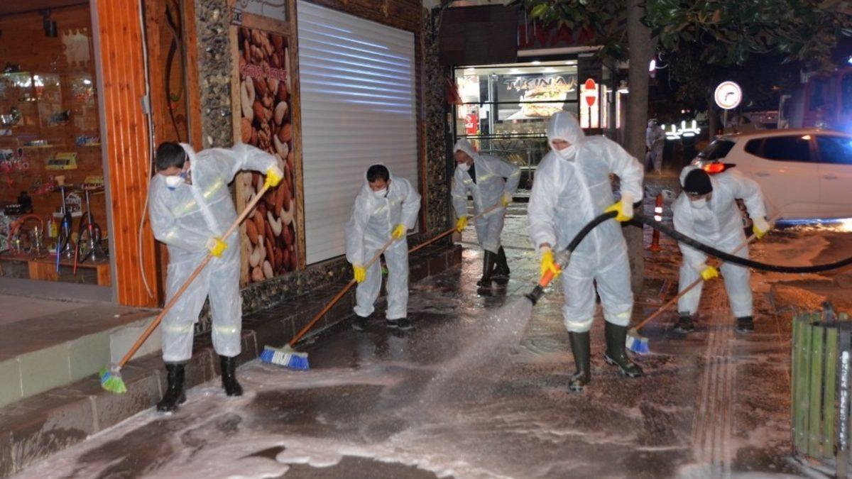 Sokakların köpüklü suyla yıkanması için çalışmaların günlük olarak belirlenen program dahilinde devam edeceği açıklandı.