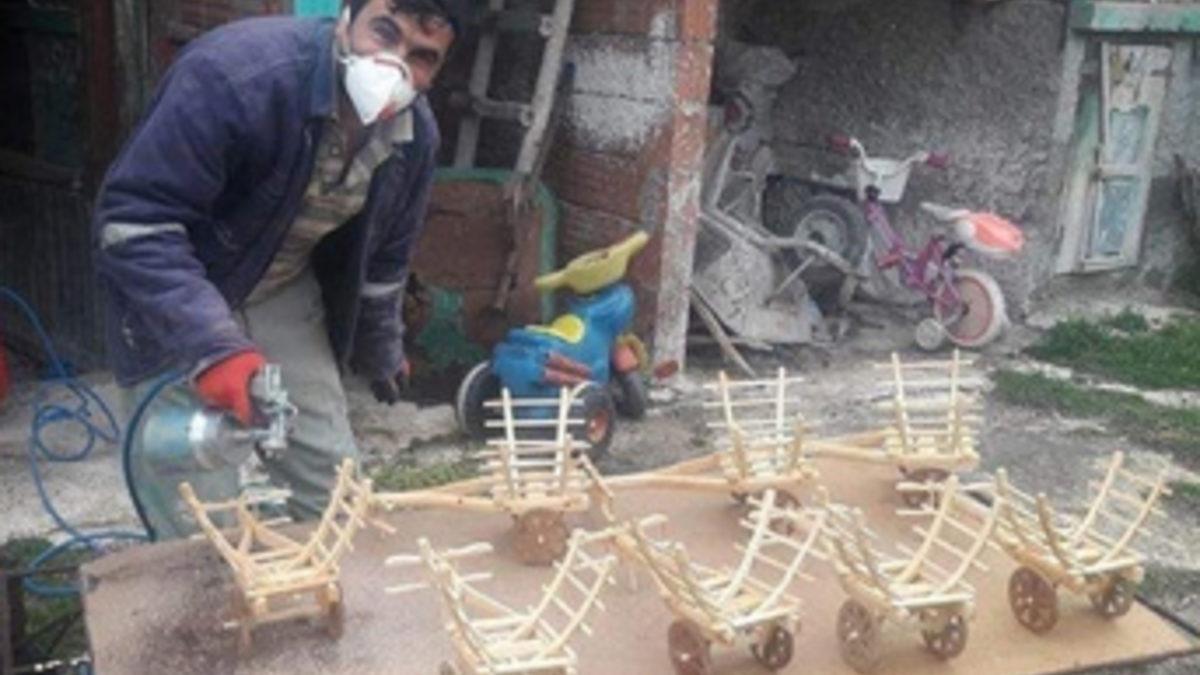 Kütahya’nın Emet ilçesinde yaşayan İsmail Hakkı Günal’ın tamamen el emeğiyle ile yaptığı kağnı, terazi ve ev gereçleri büyük ilgi görüyor.Dedesinin marangoz olduğunu belirten 34 yaşındaki Günal, ’’Daha 7 yaşımda iken dedemin teşvik etmesiyle bu sanatı hobi olarak yapmaya başladım.