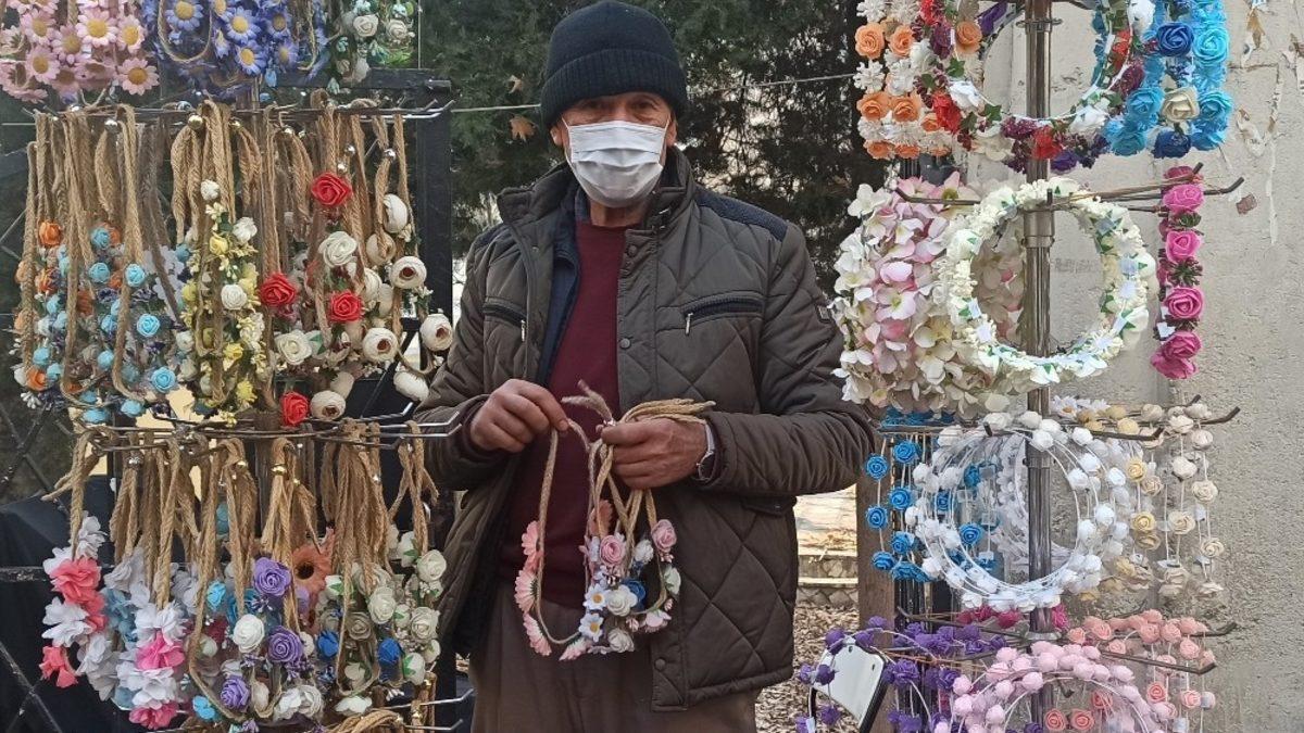 Tarihi Kapalı Çarşıda 7 yıldır el emeği göz nuru ürünlerini satarak geçimini sağlayan 4 çocuk babası Mustafa Gül, “Çiçekten taçlar yaparak hem paramı kazanıyorum hem de insanları mutlu etmenin huzurunu yaşıyorum” dedi.