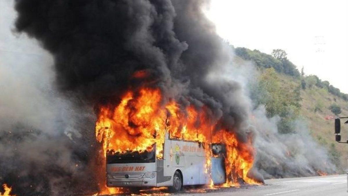 Kocaeli TEM otoyolu İzmit Gültepeler mevkiinde, içerisinde 32 yolcunun bulunduğu otobüs alev alev yandı. Yolcular son anda indiği otobüsten sıçrayan alevler nedeniyle yol kenarındaki ağaçlık alanda yangın çıktı.Edinilen bilgiye göre, İstanbul’dan Muş’a gitmekte olan ve sürücüsünün ismi öğrenilemeyen 06 DL 5535 plakalı yolcu otobüsünden duman çıktığını fark eden yolcular, durumu sürücüye haber verdi. Sürücünün emniyet şeridine çektiği otobüsün boşaltılmasının ardından alevler bir anda büyüdü. Yolcuların haber vermesi üzerine olay yerine çok sayıda itfaiye ekibi sevk edilirken, yangında yaşanan patlamalar nedeniyle TEM otoyolunda trafik polis ekipleri tarafından geçici olarak durduruldu. Olay yerine gelen gelen itfaiye ekiplerinin müdahale ettiği yangında alevler bir anda yol kenarındaki ağaçlık alana sıçradı. Ağaçların tutuşması nedeniyle bölgeye çevre ilçelerden itfaiye aracı takviyesi yapıldı.Yanan otobüsten son anda inen 32 yolcu korku dolu gözlerle otobüsün yanmasını izlerken, yangın nedeniyle gökyüzünü siyah dumanlar kapladı. İtfaiyenin uzun süren müdahalesi sonrasında alevler kontrol altına alınırken, yolda kalan yolcular ise polis ekiplerince dinlenme tesislerine götürüldü. Tamamen yanarak hurdaya dönen otobüsün yolcuları daha sonra Kocaeli Büyükşehir Belediyesi’nden temin edilen otobüs ile İzmit Şehirler Arası Otobüs Terminali’ne götürüldüler. Yanan araçtan son anda inen yolcular, sürücünün araçtan dumanlar çıktığını öğrenmesi sonrasında aracı durdurduktan sonra kaçarak olay yerinden uzaklaştığını ve kendilerine yardımcı olmadığını iddia etti.Yangında herhangi bir can kaybının yaşanmazken, yangın nedeniyle iki yönlü trafiğe kapatılan TEM otoyolu ise yeniden trafiğe açıldı.Polis ekipleri olayla ilgili inceleme başlattı.