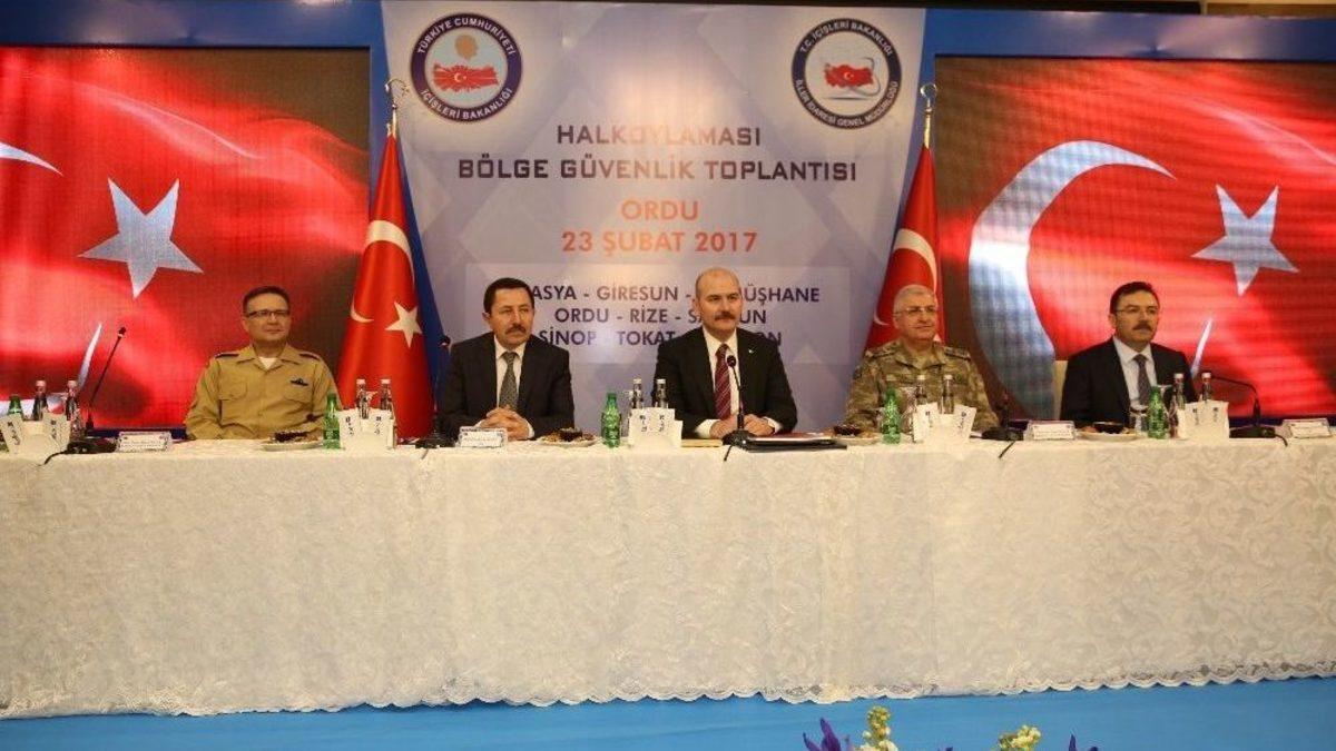İçişleri Bakanı Süleyman Soylu, 16 Nisan’da gerçekleştirilecek referandum öncesi 9 ilin valileri, jandarma komutanları, emniyet müdürleri ve sahil güvenlik komutanları ile Ordu’ya gelerek ’Halkoylaması Bölge Güvenlik Toplantısı’ yaptı.Erzurum’dan havayoluyla Ordu’ya gelen İçişleri Bakanı Süleyman Soylu, Ordu-Giresun Havalimanında Ordu Valisi İrfan Balkanlıoğlu, Giresun Valisi Hasan Karahan, Giresun Jandarma Bölge Komutanı Tuğgeneral Hakan Saraç, Vali Yardımcısı Mehmet Erhan Türker, İl Emniyet Müdürü Suat Çelik, İl Jandarma Komutanı Albay Sedat Sarıkaya, Altınordu Belediye Başkanı Engin Tekintaş, AK Parti İl Başkanı Uğur Çelenk ve protokol mensupları tarafından karşılandı. Bakan Soylu’nun gelişi sebebiyle Ordu-Giresun Havalimanında olağanüstü güvenlik tedbirleri alındı.Teleferikle birlikte Boztepe’ye çıkan İçişleri Bakanı Süleyman Soylu, Boztepe’de Radisson Blu Otel’de düzenlenen ‘Halkoylaması Bölge Güvenlik Toplantısı’na iştirak etti.İçişleri Bakanı Süleyman Soylu başkanlığında gerçekleştirilen toplantıya, Jandarma Genel Komutanı Orgeneral Yaşar Güler, Emniyet Genel Müdürü Selami Altınok, Sahil Güvenlik Genel Komutanı Bülent Olcay, Ordu, Amasya, Giresun, Gümüşhane, Rize, Samsun, Sinop, Tokat ve Trabzon illerinin Valileri, İl Emniyet Müdürleri, İl Jandarma Komutanları ve Sahil Güvenlik Komutanları katıldı.Toplantıda, 16 Nisan 2017 Pazar günü gerçekleştirilecek referandumun güven ve huzur ortamında yapılabilmesi için alınacak güvenlik tedbirleri görüşüldü.Halkoylamasının huzur ve güven içinde gerçekleşebilmesi, vatandaşların hiçbir baskı ve tehdit ortamına maruz kalmadan hür iradeleriyle seçim yapabilmeleri amacıyla, oylama öncesi, referandum günü ve sonrasını kapsayacak şekilde alınabilecek tedbirler geniş kapsamlı olarak masaya yatırıldı.