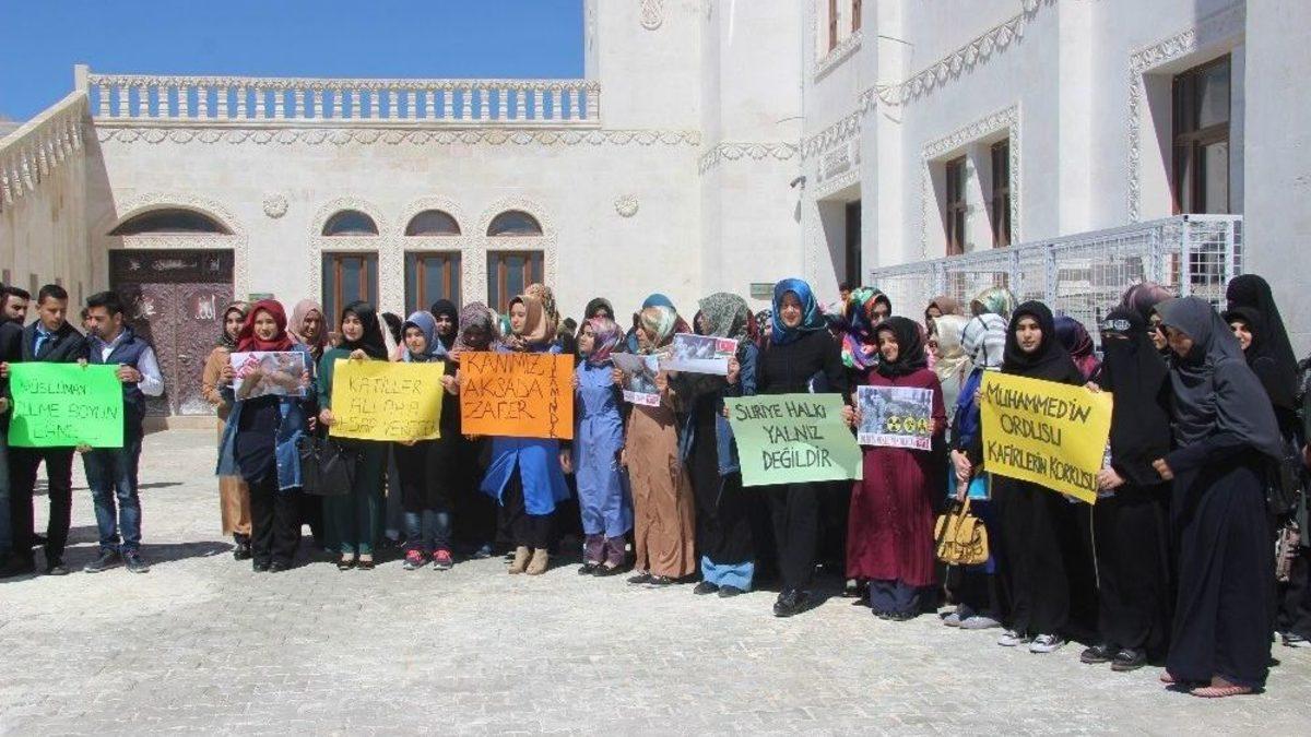 Suriye rejim güçlerinin İdlib’de yaptığı kimyasal saldırı Anadolu Öğrenci Birliği Kilis Temsilciliği tarafından basın açıklaması yapılarak protesto edildi.Suriye’nin İdlib kentine rejim tarafından düzenlenen kimyasal hava saldırısında çok sayıda insanın ölmesi ve yaralanmasına tepki göstermek için Kilis 7 Aralık Üniversitesi Camii’nde toplanan Anadolu Öğrenci Birliği Kilis Temsilciliği üyeleri, basın açıklaması yaptı. Anadolu Öğrenci Birliği Kilis Temsilciliği adına Nurettin Taş’ın yaptığı basın açıklamasında, 6 yıldır Suriye’de yaklaşık bir milyon insanın ölümüne yol açan insanlık dışı katliamların maalesef katlanarak devam ettiği belirtildi.Taş, kimyasal silahların dün İdlib’de çoğu çocuk onlarca insana ölüm kustuğunu ifade ederek, “Bu katliamda Rusya, ABD, İran başta olmak üzere emperyalist Batı, katil Esed’in suç ortaklarıdır. Aç gözlü emperyalist işgalciler, insanlık düşmanı muhterisler, hainler, kalleşler. İnsanlarımız ve şehirlerimiz sizin kirli ellerinizle perişan oldu. Bütün evlerimizi yaktınız. Dedeleriniz Endülüs’te soykırım yaptı ve siz Haçlı artıkları, Saraybosna’da soykırıma yeltendiniz, Beyrut yaralandı, Kahire vuruldu, Kudüs esir, Gazze hapis, Şam yandı, Bağdat perişan, Basra harap, Halep düştü. İslam medeniyetinin tüm şehirlerini, tüm değerlerini, camilerini, köprülerini, hanlarını yaktınız, yıktınız, işgal ettiniz, esir aldınız. 200 yıldır, etimizi koparır gibi kopardınız şehirlerimizi tarihin kalbinden. O kadim şehirlerde yaşattığımız insanlığı, huzuru, mutluluğu, kardeşliği, medeniyeti vurdunuz, talan ettiniz. Canımıza tak etti artık. Artık gözlerimizin içine baka baka İslam coğrafyasındaki kardeşlerimizin katledilişine sessiz kalmayacağız. Artık bizi Endülüs’süz, Halep’siz, Şam’sız, Hama’sız, Musul’suz, Kudüs’süz, Kerkük’süz bırakıp İstanbul’u yakma girişimlerinize seyirci kalmayacağız. Kadınlarımıza, yaşlılarımıza ve çocuklarımıza uzanan o kirli ellerinizi kırmaya ahdettik. ‘Kim bilir belki yarın, belki yarından da yakın’’ Bilinsin ki bizim kitabımızda zalimlerden başkasına düşmanlık yoktur. Bu coğrafyada döktüğünüz her damla kanın, zulmettiğiniz her mazlumun hesabını soracağız sizlerden” dedi.Açıklamanın devamında şu ifadeler yer aldı:"İdlib’de insanlık suçu işleyen, hiçbir vicdanın kabul edemeyeceği yöntemlerle masum sivilleri katleden zalim rejim ve emperyalist destekçileri bilin ki vekalet savaşlarınızı yürüten taşeron örgütlerinizle de, Halep’i, İdlib’i kan gölüne çeviren paralı köpeklerinizle de ve siz kuklacı emperyalistlerle de hesaplaşacağız. Anadolu Öğrenci Birliği olarak yeryüzünde hürriyetin ve adaletin hakim olması için çabamız, ümidimiz, gayretimiz ve mücadelemiz artarak devam edecek. Yeryüzünün bütün mağdur, mazlum ve müstazaflarına kol kanat germeye, kucak açmaya devam edeceğiz. Son nefesimize kadar ümitle ve azimle gayret edeceğiz. Üzüleceğiz, kalbimiz taşlaşmasın diye ağlayacağız ama gevşemeyeceğiz, asla ve asla ümitsizliğe kapılmayacağız, pes etmeyeceğiz.”Döviz ve pankarlar taşıyan öğrenciler, tekbir getirerek Esad yönetimini protesto etti.