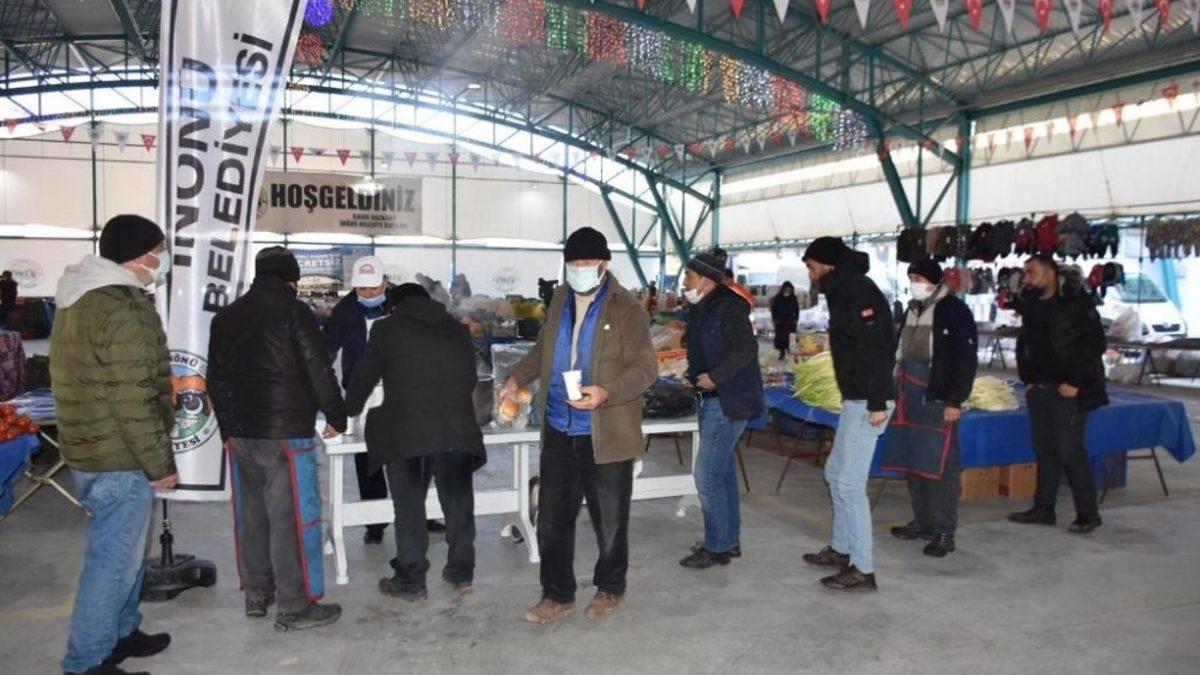 Yapılan pazar duasının ardından İnönü Belediye Başkanlığı tarafından geleneksel hale getirilen pazarcı esnafı ve ilçe sakinlerine sıcak çorba ikramı yapıldı. Pazarcı esnafının tezgahlarını açmadan ve alışverişe gelen vatandaşların bir nebze içini ısıtmak amacıyla her Perşembe kurulan pazar öncesi sabahın erken saatlerinde başlayan çorba dağıtımı yoğun ilgi görüyor.