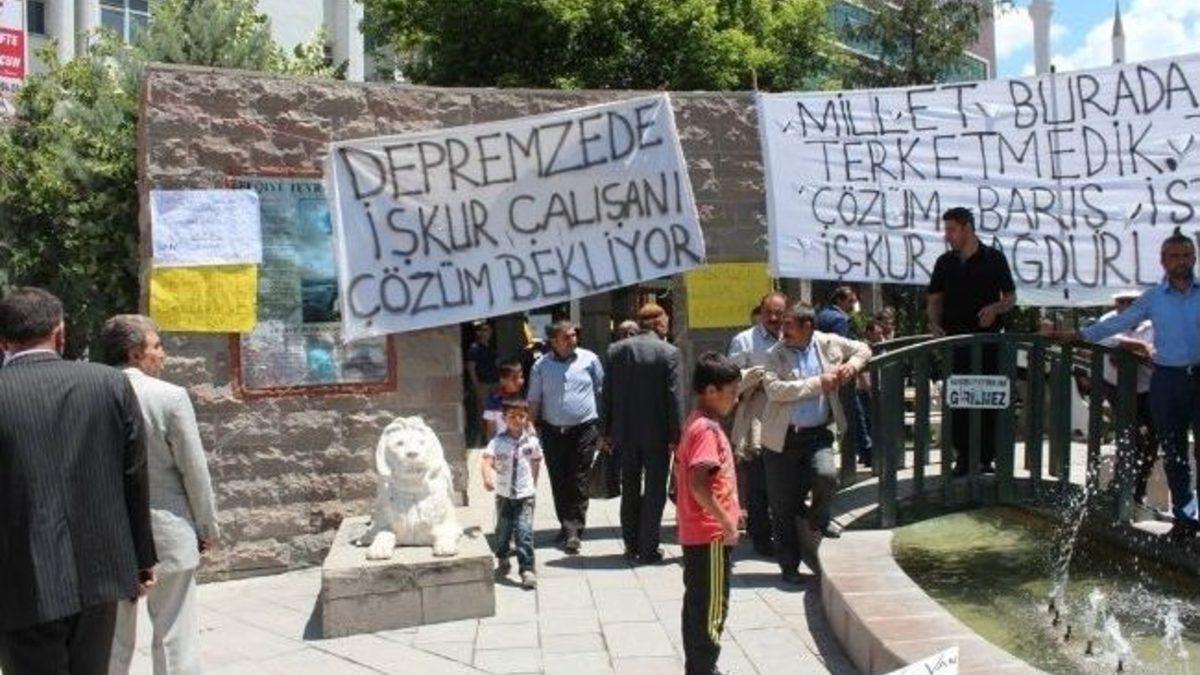 Van’da meydana gelen depremden sonra İş-Kur İl Müdürlüğü bünyesinde işe alınan ve geçen hafta işten çıkarılan 7 bin 286 işçi, oturma eylemine devam ediyor.Toplum Yararına Çalışma Derneği (TYÇD) üyeleri ile 7 bin 286 İş-Kur çalışanlarının Feqiye Teyran Parkı’ndaki oturma eylemi 5. gününe girdi. Önceki gün Van Valisi Aydın Nezih Doğan ile görüştüklerini ifade eden Maşallah Türkan, “Biz deprem sonrası İş-Kur bünyesinde devlet kurumlarında işe alındık. 13 Haziran itibariyle de işimize son verdiler. Mağduriyetimizin giderilmesi için herhangi bir yetkili bizimle ilgilenmiyor. Valiyle görüştük. Vali bir şey yapamayacağını, herhangi bir hakkımızın olmadığını söyledi. Biz deprem görmüş bir kitleyiz, durumumuz çok vahim. Çalıştığımız kurumlarda, birimlerde bizlere ihtiyaç var. Bizimde o işe ihtiyacımız var. Biz Türkiye Cumhuriyeti’nin vatandaşlarıyız. Evimize ekmek götüremiyoruz. Herkesin 4-5 çocuğu var. Çok zor durumdayız. Devlet büyüklerinin bize çare bulması gerekiyor. Çoluk çocuğumuz bizden ekmek bekliyor. Ramazan ayı geldi, soframıza bir tane iftar ekmeği koyacak durumumuz yok. Yiyecek bir yemeğimiz yok. 7 bin 286 arkadaşımız aynı durumdadır. Bu soruna çare bulunmasını bekliyoruz” dedi.TYÇD Başkanı Ethem Altın da, davalarının ekmek davası olduğunu belirterek, “Bu sorun üç seneden beri yaklaşık 75 bin insanı ilgilendiren bir sorundur. Üç seneden beri çeşitli yetkili mercilere başvurduk. Özellikle Sayın Başbakanımıza, bakanlarımıza, milletvekillerimize gitmemize rağmen, 112 tane dilekçe vermemize rağmen, her seferinde bizi oyaladılar, her seferinde bize farklı şeyler söylediler. Bizi oyalaya oyalaya bu tarihe kadar getirdiler. Üç yıldan beri yaklaşık 7 bin 286 arkadaşımız, aileleriyle birlikte 75 bin insana tekabül ediyor. Deprem döneminde göç eden insanlarımızın çoğu dönmedi Van’a. Ona rağmen bu depremzede kardeşlerimiz Van’ı terk etmediler, gece sabahlara kadar nöbet tuttular, sabahtan akşama kadar da depremzede kardeşlerimize gıda yardımı, çadır, bütün ihtiyaçlarını karşılamak adına gayret gösterdiler. En son maalesef 13 Haziran 2014 tarihinde bir daha işe alınmamak üzere 7 bin 286 kardeşimizi işten çıkardılar, kapı dışarı ettiler. Yani seçim bitti iş de bitti anlamına gelmektedir. Biz demokratik haklarımızı en iyi şekilde 3 senedir sürdürüyoruz. Yasa dışı eylemler bugüne kadar yapmadık ama bu saatten sonra eylemimizin 5. günündeyiz. Bu kadar insanı ilgilendiren, insanın hayatı söz konusu olan bu olayda yetkililerin sessiz kalmalarını kınıyoruz, nefret ediyoruz. Bu 75 bin insan bu saatten sonra nereye gidecek? Önümüzdeki hafta Ramazan ayına giriyoruz. Burada ben adaleti sağlayacağım, ben insan haklarından sorumluyum, ben bütün insanlara eşit şekilde muamele edeceğim diyen yetkili, diyen siyasi, diyen bakan, diyen Başbakana sesleniyoruz. Van’da şu an bir insanlık dramı yaşanıyor. Biz eylemimizin çıtasını yükseltiyoruz. Bundan sonraki süreçte açlık grevi ve ölüm orucuna devam edeceğiz” şeklinde konuştu.