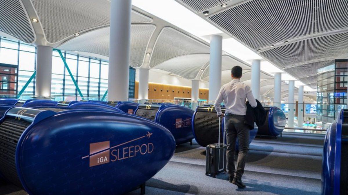 Uçuşu rötar yapan ya da uzun süre beklemeli transit uçuşların yolcuları için verilmeye başlanan 'sleepod' uygulaması İstanbul Havalimanı Dış Hatlar Temninali’nde hayata geçirildi.