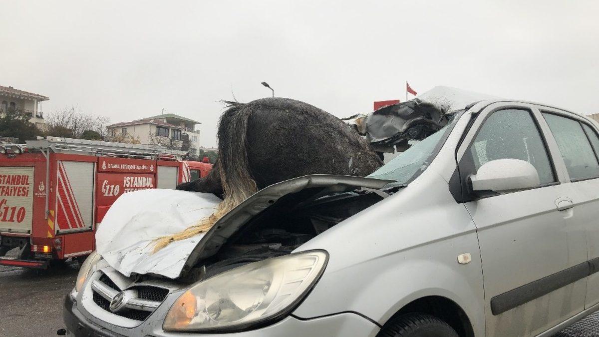 İstanbul’da yol kenarında başıboş gezen 3 at, otomobilin çarpması sonucu telef oldu. Atlardan biri çarpmanın etkisiyle otomobilin ön camından içeri girdi. Araç sürücüsü ise feci kazayı ufak sıyrıklarla atlattı.